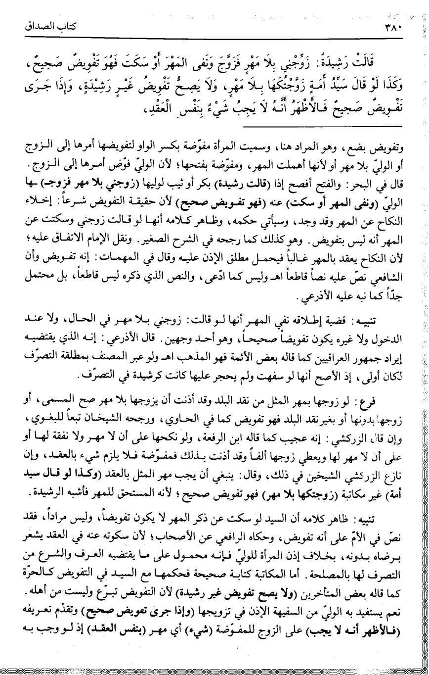 ، وَلَوْ نَكَحَهَا عَلَى أَنْ لَا مَهْرَ وَلَا نَفَقَةَ لَهَا أَوْ عَلَى أَنْ لَا مَهْرَ لَهَا وَيُعْطِيَ زَوْجَهَا أَلْفًا وَقَدْ أَذِنَتْ بِذَلِكَ فَمُفَوِّضَةٌ فَلَا يَلْزَمُ شَيْءٌ بِالْعَقْدِ، وَإِنْ نَازَعَ الزَّرْكَشِيُّ الشَّيْخَيْنِ فِي ذَلِكَ، وَقَالَ: يَنْبَغِي أَنْ يَجِبَ مَهْرُ الْمِثْلِ بِالْعَقْدِ (وَكَذَا لَوْ قَالَ سَيِّدُ أَمَةٍ) غَيْرِ مُكَاتَبَةٍ (زَوَّجْتُكَهَا بِلَا مَهْرٍ) فَهُوَ تَفْوِيضٌ صَحِيحٌ؛ لِأَنَّهُ الْمُسْتَحِقُّ لِلْمَهْرِ فَأَشْبَهَ الرَّشِيدَةَ.