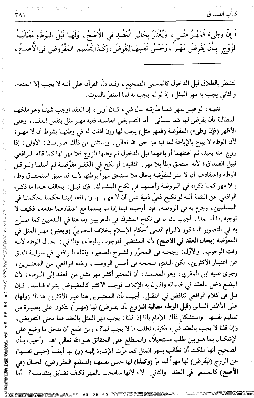 أُجِيبَ بِأَنَّ الْمُعْتَبِرِينَ هُنَا غَيْرُ الْأَكْثَرِينَ هُنَاكَ (وَلَهَا) عَلَى الْأَظْهَرِ السَّابِقِ (قَبْلَ الْوَطْءِ مُطَالَبَةُ الزَّوْجِ بِأَنْ يَفْرِضَ) لَهَا (مَهْرًا) لِتَكُونَ عَلَى بَصِيرَةٍ مِنْ تَسْلِيمِ نَفْسِهَا. وَاسْتَشْكَلَ ذَلِكَ الْإِمَامُ بِأَنَّا إذَا قُلْنَا: يَجِبُ مَهْرُ الْمِثْلِ بِالْعَقْدِ فَمَا مَعْنَى التَّفْوِيضِ، وَإِنْ قُلْنَا لَا يَجِبُ بِالْعَقْدِ شَيْءٌ فَكَيْفَ تَطْلُبُ مَا لَا يَجِبُ لَهَا؟ ، وَمَنْ طَمِعَ أَنْ يُلْحِقَ مَا وُضِعَ عَلَى الْإِشْكَالِ بِمَا هُوَ بَيِّنٌ طَلَبَ مُسْتَحِيلًا، وَالْمُطَّلِعُ عَلَى الْحَقَائِقِ هُوَ اللَّهُ تَعَالَى اهـ. .