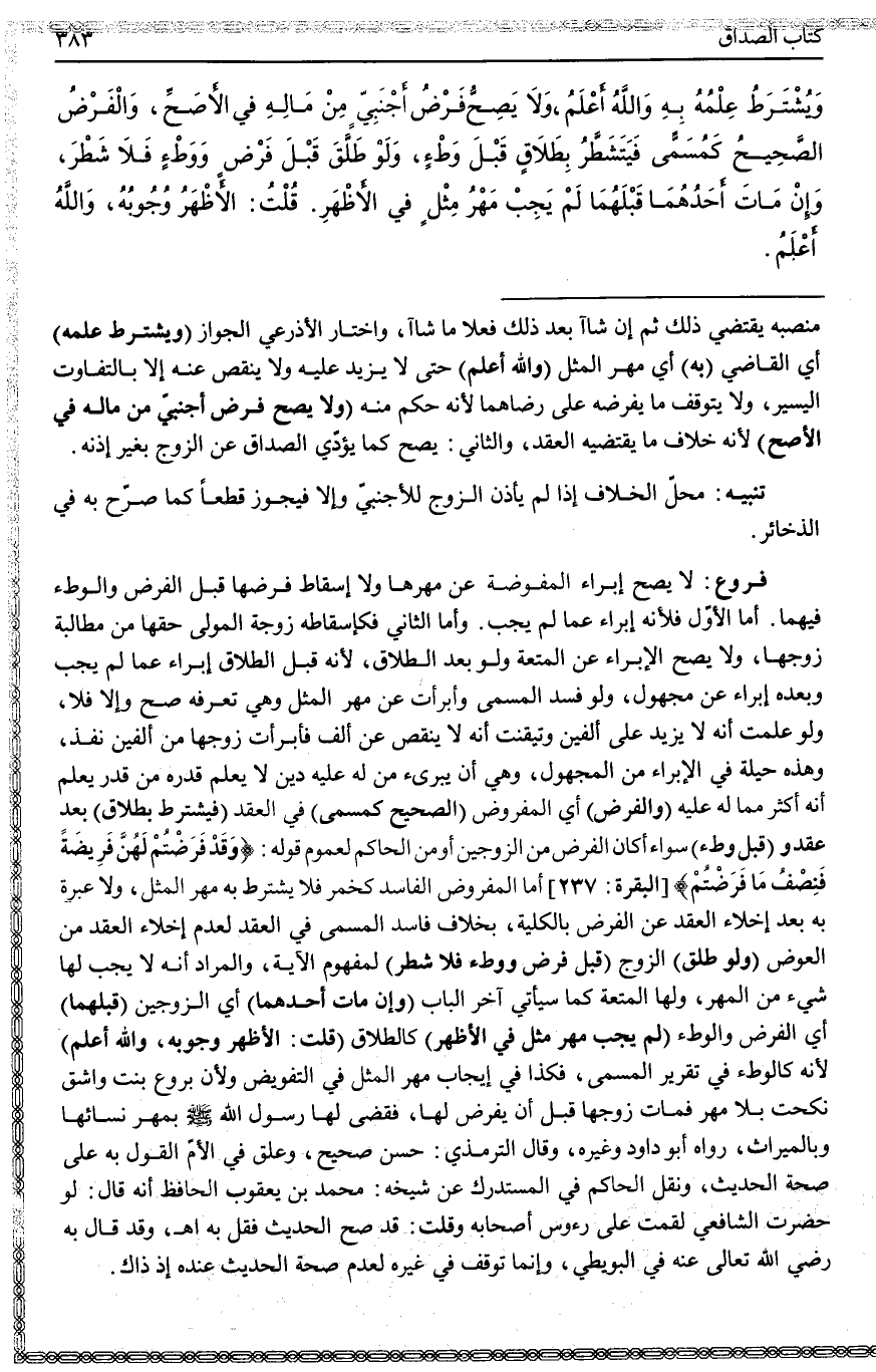 (وَالْفَرْضُ) أَيْ الْمَفْرُوضُ (الصَّحِيحُ كَمُسَمًّى) فِي الْعَقْدِ (فَيَتَشَطَّرَ بِطَلَاقٍ) بَعْدَ عَقْدٍ وَ (قَبْلَ وَطْءٍ) سَوَاءٌ أَكَانَ الْفَرْضُ مِنْ الزَّوْجَيْنِ أَوْ مِنْ الْحَاكِمِ لِعُمُومِ قَوْلِهِ: {وَقَدْ فَرَضْتُمْ لَهُنَّ فَرِيضَةً فَنِصْفُ مَا فَرَضْتُمْ} [البقرة: 237] [الْبَقَرَةُ] أَمَّا الْمَفْرُوضُ الْفَاسِدُ كَخَمْرٍ فَلَا يَتَشَطَّرُ بِهِ مَهْرُ الْمِثْلِ، وَلَا عِبْرَةَ بِهِ بَعْدَ إخْلَاءِ الْعَقْدِ عَنْ الْفَرْضِ بِالْكُلِّيَّةِ، بِخِلَافِ فَاسِدِ الْمُسَمَّى فِي الْعَقْدِ لِعَدَمِ إخْلَاءِ الْعَقْدِ مِنْ الْعِوَضِ (وَلَوْ طَلَّقَ) الزَّوْجُ (قَبْلَ فَرْضٍ وَوَطْءٍ فَلَا شَطْرَ) لِمَفْهُومِ الْآيَةِ، وَالْمُرَادُ أَنَّهُ لَا يَجِبُ لَهَا شَيْءٌ مِنْ الْمَهْرِ، وَلَهَا الْمُتْعَةُ كَمَا سَيَأْتِي آخِرَ الْبَابِ.