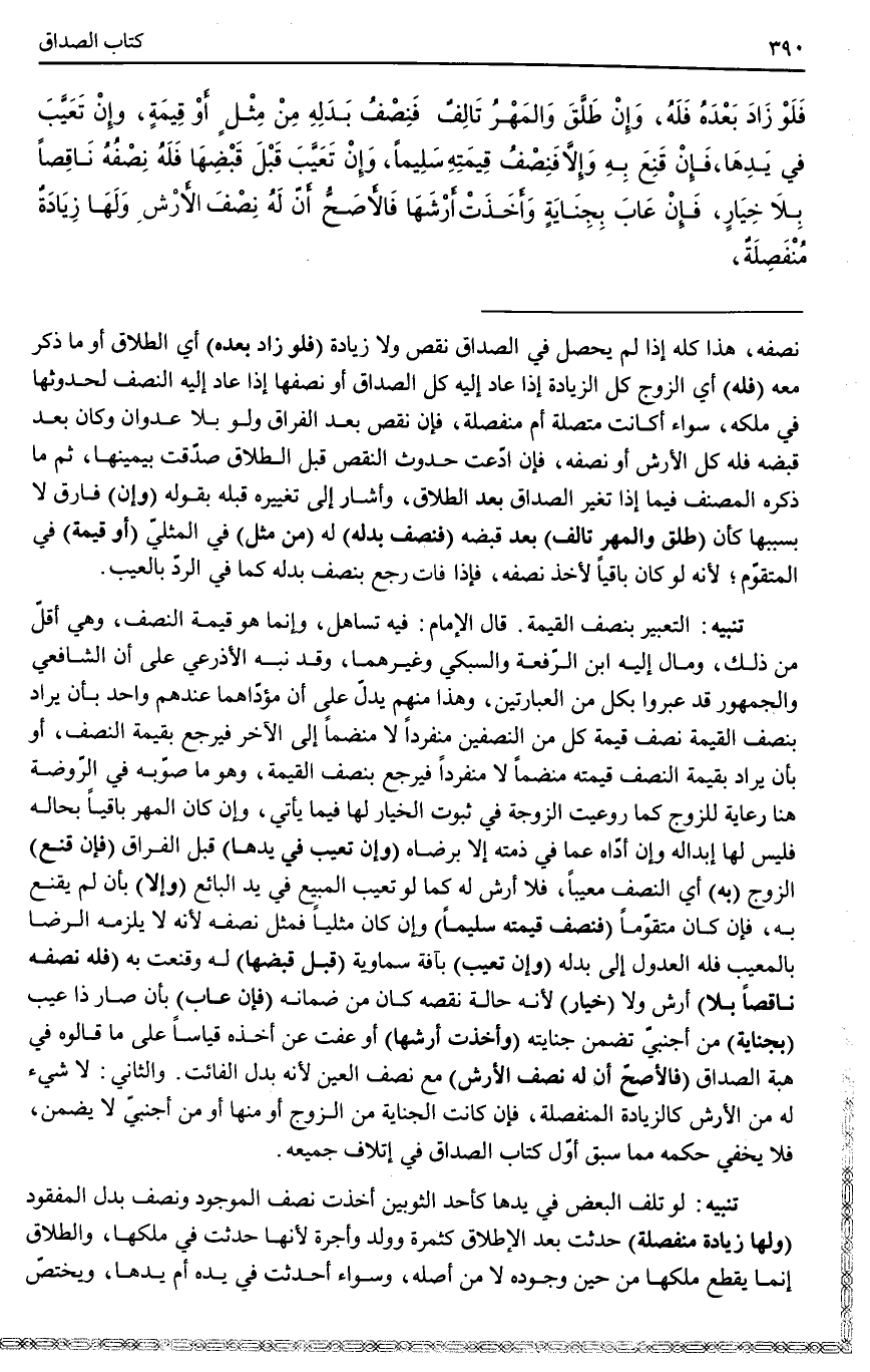 ـــــــــــــــــــــــــــــQنِصْفِهِ، هَذَا كُلُّهُ إذَا لَمْ يَحْصُلْ فِي الصَّدَاقِ نَقْصٌ وَلَا زِيَادَةٌ (فَلَوْ زَادَ بَعْدَهُ) أَيْ الطَّلَاقِ أَوْ مَا ذُكِرَ مَعَهُ (فَلَهُ) أَيْ الزَّوْجِ كُلُّ الزِّيَادَةِ إذَا عَادَ إلَيْهِ كُلُّ الصَّدَاقِ أَوْ نِصْفُهَا إذَا عَادَ إلَيْهِ النِّصْفُ لِحُدُوثِهَا فِي مِلْكِهِ، سَوَاءٌ أَكَانَتْ مُتَّصِلَةً أَمْ مُنْفَصِلَةً، فَإِنْ نَقَصَ بَعْدَ الْفِرَاقِ وَلَوْ بِلَا عُدْوَانٍ وَكَانَ بَعْدَ قَبْضِهِ فَلَهُ كُلُّ الْأَرْشِ أَوْ نِصْفُهُ، فَإِنْ ادَّعَتْ حُدُوثَ النَّقْصِ قَبْلَ الطَّلَاقِ صُدِّقَتْ بِيَمِينِهَا، ثُمَّ مَا ذَكَرَهُ الْمُصَنِّفُ فِيمَا إذَا تَغَيَّرَ الصَّدَاقُ بَعْدَ الطَّلَاقِ، وَأَشَارَ إلَى تَغْيِيرِهِ قَبْلَهُ بِقَوْلِهِ.