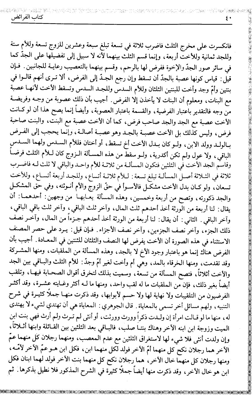 أُجِيبَ بِأَنَّ ذَلِكَ عُصُوبَةٌ مِنْ وَجْهٍ وَفَرِيضَةٌ مِنْ وَجْهٍ فَالتَّقْدِيرُ بِاعْتِبَارِ الْفَرْضِيَّةِ، وَالْقِسْمَةُ بِاعْتِبَارِ الْعُصُوبَةِ، وَأَيْضًا إنَّمَا يَصِحُّ هَذَا أَنْ لَوْ كَانَتْ الْأُخْتُ عَصَبَةً مَعَ الْجَدِّ وَالْجَدُّ صَاحِبُ فَرْضٍ، كَمَا أَنَّ الْأُخْتَ عَصَبَةٌ مَعَ الْبِنْتِ، وَالْبِنْتُ صَاحِبَةُ فَرْضٍ، وَلَيْسَ كَذَلِكَ بَلْ الْأُخْتُ عَصَبَةٌ بِالْجَدِّ وَهُوَ عَصَبَةٌ أَصَالَةً، وَإِنَّمَا يُحْجَبُ إلَى الْفَرْضِ بِالْوَلَدِ وَوَلَدِ الِابْنِ، وَلَوْ كَانَ بَدَلَ الْأُخْتِ أَخٌ تَسْقُطُ، أَوْ أُخْتَانِ فَلِلْأُمِّ السُّدُسُ وَلَهُمَا السُّدُسُ الْبَاقِي، وَلَا عَوْلَ وَلَمْ تَكُنْ أَكْدَرِيَّةً، وَلَوْ سَقَطَ مِنْ هَذِهِ الْمَسْأَلَةِ الزَّوْجُ كَانَ لِلْأُمِّ الثُّلُثُ فَرْضًا وَقَاسَمَ الْجَدُّ الْأُخْتَ فِي الثُّلُثَيْنِ فَتَكُونُ الْمَسْأَلَةُ مِنْ ثَلَاثَةٍ لِلْأُمِّ وَاحِدٌ وَالْبَاقِي لَا ثُلُثَ لَهُ فَاضْرِبْ ثَلَاثَةً فِي الثَّلَاثَةِ أَصْلِ الْمَسْأَلَةِ تَبْلُغْ تِسْعَةً: لِلْأُمِّ ثَلَاثَةُ أَتْسَاعٍ، وَلِلْجَدِّ أَرْبَعَةُ أَتْسَاعٍ، وَلِلْأُخْتِ تُسْعَانِ، وَلَوْ كَانَ بَدَلَ الْأُخْتِ مُشْكِلٌ فَالْأَسْوَأُ فِي حَقِّ الزَّوْجِ وَالْأُمِّ أُنُوثَتُهُ، وَفِي حَقِّ الْمُشْكِلِ وَالْجَدِّ ذُكُورَتُهُ، وَتَصِحُّ مِنْ أَرْبَعَةٍ وَخَمْسِينَ، وَهَذِهِ الْمَسْأَلَةُ يُعَالُ بِهَا مِنْ وَجْهَيْنِ: أَحَدِهِمَا: أَنْ يُقَالَ: لَنَا أَرْبَعَةٌ مِنْ الْوَرَثَةِ أَخَذَ أَحَدُهُمْ ثُلُثَ الْمَالِ، وَآخَرُ ثُلُثَ الْبَاقِي، وَآخَرُ ثُلُثَ بَاقِي الْبَاقِي، وَآخَرُ الْبَاقِيَ. الثَّانِي: أَنْ يُقَالَ: لَنَا أَرْبَعَةٌ مِنْ الْوَرَثَةِ أَخَذَ أَحَدُهُمْ جُزْءًا مِنْ الْمَالِ، وَآخَرُ نِصْفَ ذَلِكَ الْجُزْءِ، وَآخَرُ نِصْفَ الْجُزْأَيْنِ، وَآخَرُ نِصْفَ الْأَجْزَاءِ. فَإِنْ قِيلَ: يَرُدُّ عَلَى حَصْرِ الْمُصَنِّفِ الِاسْتِثْنَاءَ فِي هَذِهِ الصُّورَةِ أَنَّ الْأُخْتَ يُفْرَضُ لَهَا النِّصْفُ وَالثُّلُثَانِ لِلثِّنْتَيْنِ فِي الْمُعَادَّةِ.