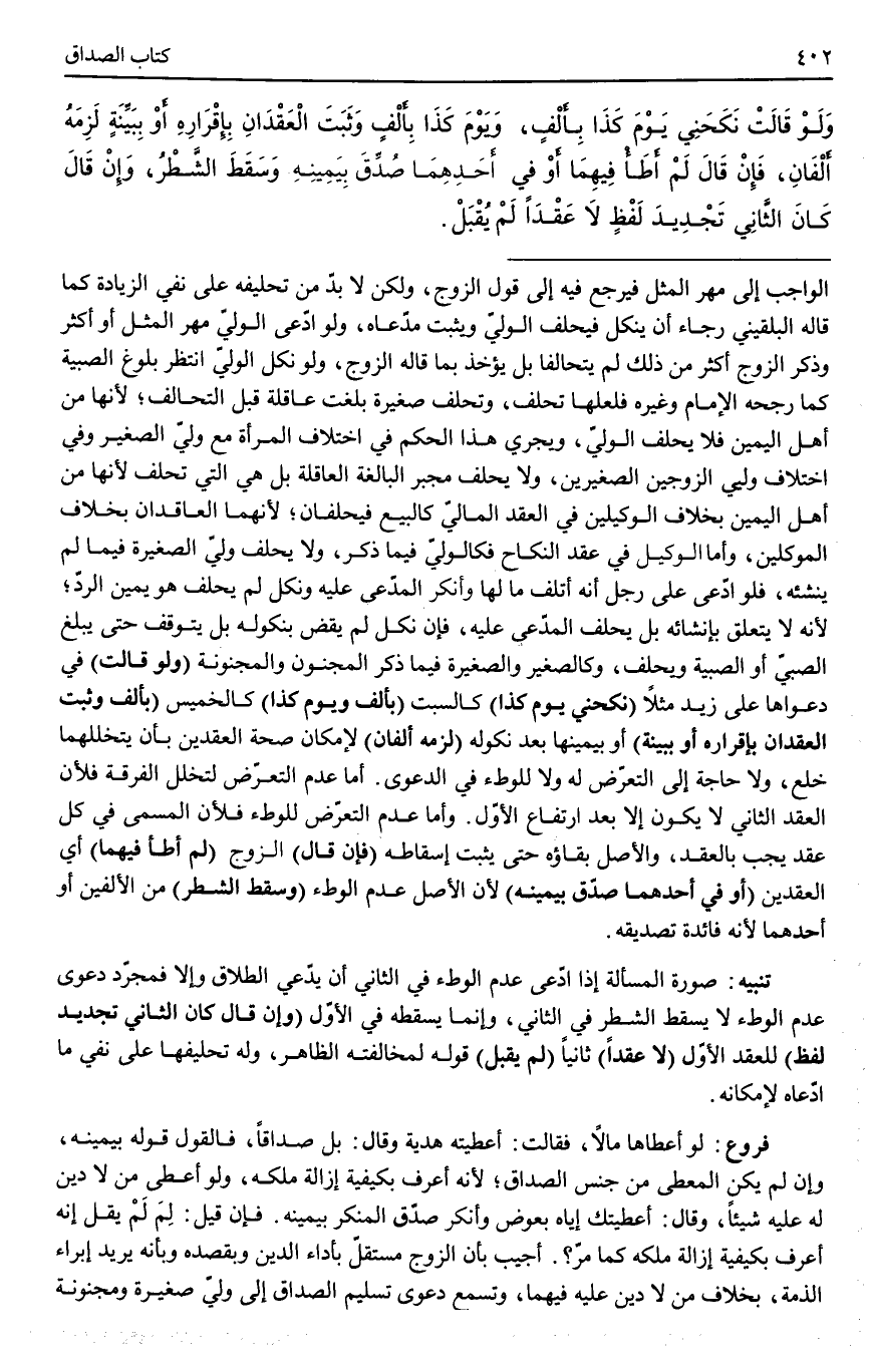 ـــــــــــــــــــــــــــــQالْوَاجِبُ إلَى مَهْرِ الْمِثْلِ فَيُرْجَعَ فِيهِ إلَى قَوْلِ الزَّوْجِ، وَلَكِنْ لَا بُدَّ مِنْ تَحْلِيفِهِ عَلَى نَفْيِ الزِّيَادَةِ كَمَا قَالَهُ الْبُلْقِينِيُّ رَجَاءَ أَنْ يَنْكُلَ فَيَحْلِفَ الْوَلِيُّ وَيُثْبِتُ مُدَّعَاهُ، وَلَوْ ادَّعَى الْوَلِيُّ مَهْرَ الْمِثْلِ أَوْ أَكْثَرَ وَذَكَرَ الزَّوْجُ أَكْثَرَ مِنْ ذَلِكَ لَمْ يَتَحَالَفَا بَلْ يُؤْخَذُ بِمَا قَالَهُ الزَّوْجُ، وَلَوْ نَكَلَ الْوَلِيُّ اُنْتُظِرَ بُلُوغُ الصَّبِيَّةِ كَمَا رَجَّحَهُ الْإِمَامُ وَغَيْرُهُ فَلَعَلَّهَا تَحْلِفُ، وَتَحْلِفُ صَغِيرَةٌ بَلَغَتْ عَاقِلَةً قَبْلَ التَّحَالُفِ؛ لِأَنَّهَا مِنْ أَهْلِ الْيَمِينِ فَلَا يَحْلِفُ الْوَلِيُّ، وَيَجْرِي هَذَا الْحُكْمُ فِي اخْتِلَافِ الْمَرْأَةِ مَعَ وَلِيِّ الصَّغِيرِ وَفِي اخْتِلَافِ وَلِيَّيْ الزَّوْجَيْنِ الصَّغِيرَيْنِ، وَلَا يَحْلِفُ مُجْبِرُ الْبَالِغَةِ الْعَاقِلَةِ بَلْ هِيَ الَّتِي تَحْلِفُ لِأَنَّهَا مِنْ أَهْلِ الْيَمِينِ بِخِلَافِ الْوَكِيلَيْنِ فِي الْعَقْدِ الْمَالِيِّ كَالْبَيْعِ فَيَحْلِفَانِ؛ لِأَنَّهُمَا الْعَاقِدَانِ بِخِلَافِ الْمُوَكِّلَيْنِ، وَأَمَّا الْوَكِيلُ فِي عَقْدِ النِّكَاحِ فَكَالْوَلِيِّ فِيمَا ذُكِرَ، وَلَا يَحْلِفُ وَلِيُّ الصَّغِيرَةِ فِيمَا لَمْ يُنْشِئْهُ، فَلَوْ ادَّعَى عَلَى رَجُلٍ أَنَّهُ أَتْلَفَ مَا لَهَا وَأَنْكَرَ الْمُدَّعَى عَلَيْهِ وَنَكَلَ لَمْ يَحْلِفْ هُوَ يَمِينَ الرَّدِّ؛ لِأَنَّهُ لَا يَتَعَلَّقُ بِإِنْشَائِهِ بَلْ يَحْلِفُ الْمُدَّعَى عَلَيْهِ، فَإِنْ نَكَلَ لَمْ يُقْضَ بِنُكُولِهِ بَلْ يُتَوَقَّفْ حَتَّى يَبْلُغَ الصَّبِيُّ أَوْ الصَّبِيَّةُ وَيَحْلِفَ، وَكَالصَّغِيرِ وَالصَّغِيرَةِ فِيمَا ذُكِرَ الْمَجْنُونُ وَالْمَجْنُونَةُ.