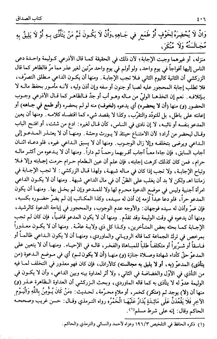 وَالْأَوْجَهُ عَدَمُ الْوُجُوبِ، وَالْمَحْجُورُ فِي إبَاحَةِ الدَّعْوَةِ كَالرَّشِيدِ، وَمِنْهَا أَنْ يَدْعُوَهُ فِي وَقْتِ الْوَلِيمَةِ وَقَدْ تَقَدَّمَ. وَمِنْهَا أَنْ لَا يَكُونَ الْمَدْعُوُّ قَاضِيًا، فَإِنْ كَانَ لَمْ تَجِبْ الْإِجَابَةُ كَمَا بَحَثَهُ بَعْضُ الْمُتَأَخِّرِينَ، وَكَذَا كُلُّ ذِي وِلَايَةٍ عَامَّةٍ. وَمِنْهَا أَنْ لَا يَكُونَ مَعْذُورًا بِمُرَخِّصٍ فِي تَرْكِ الْجَمَاعَةِ كَمَا قَالَهُ الرُّويَانِيُّ وَالْمَاوَرْدِيُّ، وَمِنْهَا أَنْ لَا يَكُونَ الدَّاعِي ظَالِمًا أَوْ فَاسِقًا أَوْ شِرِّيرًا أَوْ مُتَكَلَّفًا طَلَبًا لِلْمُبَاهَاةِ وَالْفَخْرِ، قَالَهُ فِي الْإِحْيَاءِ. وَمِنْهَا أَنْ لَا يَتَعَيَّنَ عَلَى الْمَدْعُوِّ حَقٌّ كَأَدَاءِ شَهَادَةٍ وَصَلَاةِ جِنَازَةٍ (وَ) مِنْهَا (أَنْ لَا يَكُونَ ثَمَّ) أَيْ فِي مَوْضِعِ الدَّعْوَةِ (مَنْ يَتَأَذَّى) الْمَدْعُوُّ (بِهِ، أَوْ لَا يَلِيقُ بِهِ مُجَالَسَتُهُ) كَالْأَرَاذِلِ، فَإِنْ كَانَ فَهُوَ مَعْذُورٌ فِي التَّخَلُّفِ لِمَا فِيهِ مِنْ التَّأَذِّي فِي الْأَوَّلِ وَالْغَضَاضَةِ فِي الثَّانِي، وَلَا أَثَرَ لِعَدَاوَةٍ بَيْنَهُ وَبَيْنَ الدَّاعِي، وَأَنْ لَا يَكُونَ فِي الْوَلِيمَةِ عَدُوٌّ لَهُ لَا يَتَأَذَّى بِهِ كَمَا قَالَهُ الْمَاوَرْدِيُّ، وَبَحَثَ الزَّرْكَشِيُّ أَنَّ الْعَدَاوَةَ الظَّاهِرَةَ عُذْرٌ (وَ) مِنْهَا أَنْ (لَا) يُوجَدَ ثَمَّ (مُنْكَرٌ) كَخَمْرٍ، أَوْ مَلَاهٍ مُحَرَّمَةٍ، لِحَدِيثِ: «مَنْ كَانَ يُؤْمِنُ بِاَللَّهِ وَالْيَوْمِ الْآخِرِ فَلَا يَقْعُدَنَّ عَلَى مَائِدَةٍ يُدَارُ عَلَيْهَا الْخَمْرُ» رَوَاهُ التِّرْمِذِيُّ وَقَالَ: حَسَنٌ غَرِيبٌ وَصَحَّحَهُ الْحَاكِمُ وَقَالَ: إنَّهُ عَلَى شَرْطِ مُسْلِمٍ.