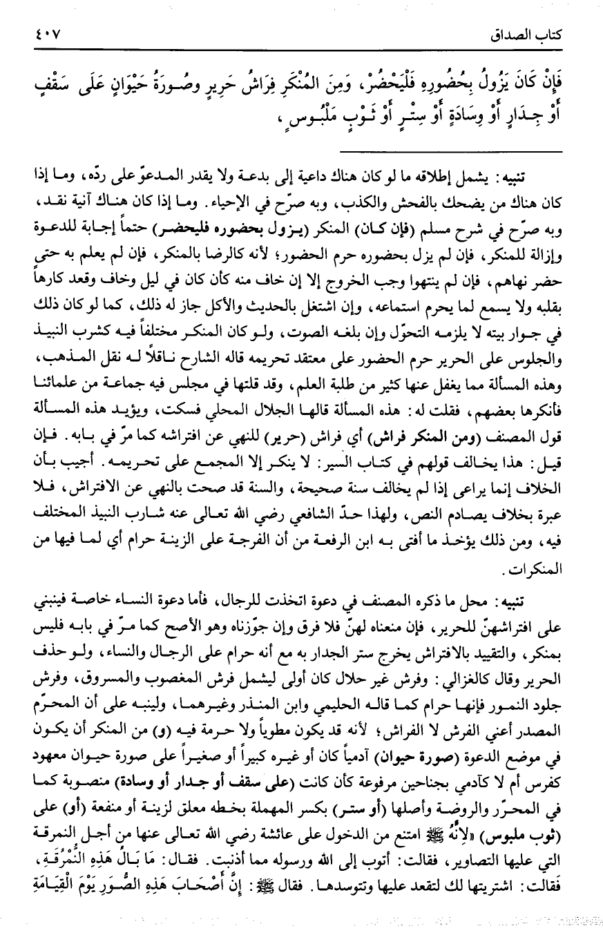 وَمِنْ الْمُنْكَرِ فِرَاشُ حَرِيرٍ وَصُورَةُ حَيَوَانٍ عَلَى سَقْفٍ أَوْ جِدَارٍ أَوْ وِسَادَةٍ أَوْ سِتْرٍ أَوْ ثَوْبٍ مَلْبُوسٍ،