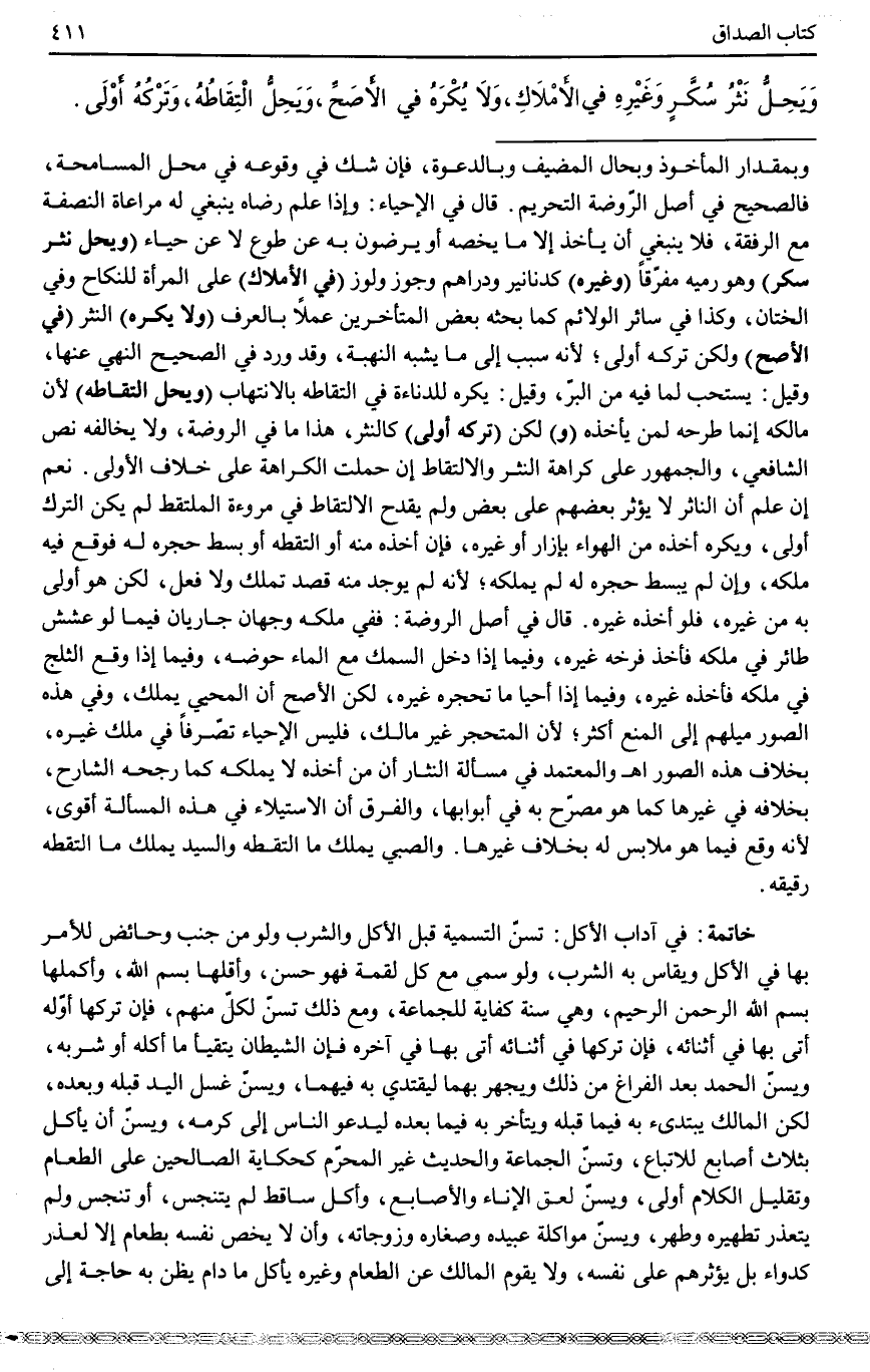 خَاتِمَةٌ: فِي آدَابِ الْأَكْلِ: تُسَنُّ التَّسْمِيَةُ قَبْلَ الْأَكْلِ وَالشُّرْبِ وَلَوْ مِنْ جُنُبٍ وَحَائِضٍ لِلْأَمْرِ بِهَا فِي الْأَكْلِ وَيُقَاسُ بِهِ الشُّرْبُ، وَلَوْ سَمَّى مَعَ كُلِّ لُقْمَةٍ فَهُوَ حَسَنٌ، وَأَقَلُّهَا بِسْمِ اللَّهِ، وَأَكْمَلُهَا بِسْمِ اللَّهِ الرَّحْمَنِ الرَّحِيمِ، وَهِيَ سُنَّةُ كِفَايَةٍ لِلْجَمَاعَةِ، وَمَعَ ذَلِكَ تُسَنُّ لِكُلٍّ مِنْهُمْ، فَإِنْ تَرَكَهَا أَوَّلَهُ أَتَى بِهَا فِي أَثْنَائِهِ، فَإِنْ تَرَكَهَا فِي أَثْنَائِهِ أَتَى بِهَا فِي آخِرِهِ فَإِنَّ الشَّيْطَانَ يَتَقَيَّأُ مَا أَكَلَهُ أَوْ شَرِبَهُ، وَيُسَنُّ الْحَمْدُ بَعْدَ الْفَرَاغِ مِنْ ذَلِكَ وَيَجْهَرُ بِهِمَا لِيُقْتَدَى بِهِ فِيهِمَا، وَيُسَنُّ غَسْلُ الْيَدِ قَبْلَهُ وَبَعْدَهُ، لَكِنَّ الْمَالِكَ يَبْتَدِئُ بِهِ فِيمَا قَبْلَهُ وَيَتَأَخَّرُ بِهِ فِيمَا بَعْدَهُ لِيَدْعُوَ النَّاسَ إلَى كَرَمِهِ، وَيُسَنُّ أَنْ يَأْكُلَ بِثَلَاثِ أَصَابِعَ لِلِاتِّبَاعِ، وَتُسَنُّ الْجَمَاعَةُ وَالْحَدِيثُ غَيْرُ الْمُحَرَّمِ كَحِكَايَةِ الصَّالِحِينَ عَلَى الطَّعَامِ وَتَقْلِيلُ الْكَلَامِ أَوْلَى، وَيُسَنُّ لَعْقُ الْإِنَاءِ وَالْأَصَابِعِ، وَأَكْلُ سَاقِطٍ لَمْ يَتَنَجَّسْ، أَوْ تَنَجَّسَ وَلَمْ يَتَعَذَّرْ تَطْهِيرُهُ وَطَهُرَ، وَيُسَنُّ مُوَاكَلَةُ عَبِيدِهِ وَصِغَارِهِ وَزَوْجَاتِهِ، وَأَنْ لَا يَخُصَّ نَفْسَهُ بِطَعَامٍ إلَّا لِعُذْرٍ كَدَوَاءٍ بَلْ يُؤْثِرُهُمْ عَلَى نَفْسِهِ، وَلَا يَقُومُ الْمَالِكُ عَنْ الطَّعَامِ وَغَيْرُهُ يَأْكُلُ مَا دَامَ يَظُنُّ بِهِ حَاجَةً إلَى