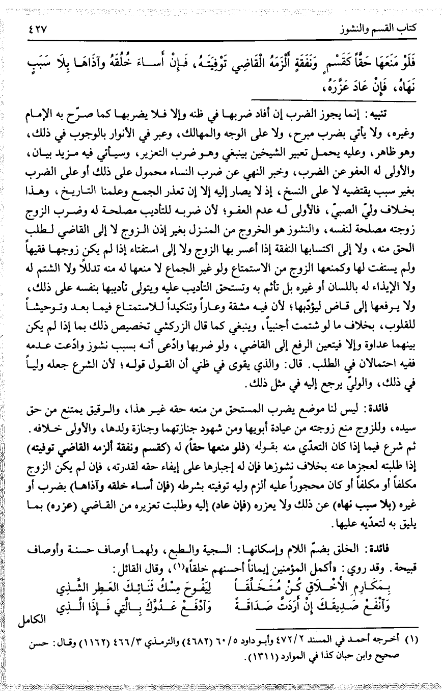 ـــــــــــــــــــــــــــــQتَنْبِيهٌ: إنَّمَا يَجُوزُ الضَّرْبُ إنْ أَفَادَ ضَرْبُهَا فِي ظَنِّهِ وَإِلَّا فَلَا يَضْرِبْهَا كَمَا صَرَّحَ بِهِ الْإِمَامُ وَغَيْرُهُ، وَلَا يَأْتِي بِضَرْبٍ مُبَرِّحٍ، وَلَا عَلَى الْوَجْهِ وَالْمَهَالِكِ، وَعَبَّرَ فِي الْأَنْوَارِ بِالْوُجُوبِ فِي ذَلِكَ، وَهُوَ ظَاهِرٌ، وَعَلَيْهِ يُحْمَلُ تَعْبِيرُ الشَّيْخَيْنِ بِيَنْبَغِي وَهُوَ ضَرْبُ التَّعْزِيرِ، وَسَيَأْتِي فِيهِ مَزِيدُ بَيَانٍ، وَالْأَوْلَى لَهُ الْعَفْوُ عَنْ الضَّرْبِ، وَخَبَرُ النَّهْيِ عَنْ ضَرْبِ النِّسَاءِ مَحْمُولٌ عَلَى ذَلِكَ أَوْ عَلَى الضَّرْبِ بِغَيْرِ سَبَبٍ يَقْتَضِيهِ لَا عَلَى النَّسْخِ، إذْ لَا يُصَارُ إلَيْهِ إلَّا إنْ تَعَذَّرَ الْجَمْعُ وَعَلِمْنَا التَّارِيخَ، وَهَذَا بِخِلَافِ وَلِيِّ الصَّبِيِّ، فَالْأَوْلَى لَهُ عَدَمُ الْعَفْوِ؛ لِأَنَّ ضَرْبَهُ لِلتَّأْدِيبِ مَصْلَحَةٌ لَهُ وَضَرْبُ الزَّوْجِ زَوْجَتَهُ مَصْلَحَةٌ لِنَفْسِهِ، وَالنُّشُوزُ هُوَ الْخُرُوجُ مِنْ الْمَنْزِلِ بِغَيْرِ إذْنِ الزَّوْجِ لَا إلَى الْقَاضِي لِطَلَبِ الْحَقِّ مِنْهُ، وَلَا إلَى اكْتِسَابِهَا النَّفَقَةَ إذَا أَعْسَرَ بِهَا الزَّوْجُ وَلَا إلَى اسْتِفْتَاءٍ إذَا لَمْ يَكُنْ زَوْجُهَا فَقِيهًا وَلَمْ يَسْتَفْتِ لَهَا وَكَمَنْعِهَا الزَّوْجَ مِنْ الِاسْتِمْتَاعِ وَلَوْ غَيْرَ الْجِمَاعِ لَا مَنْعِهَا لَهُ مِنْهُ تَدَلُّلًا وَلَا الشَّتْمُ لَهُ وَلَا الْإِيذَاءُ لَهُ بِاللِّسَانِ أَوْ غَيْرِهِ بَلْ تَأْثَمُ بِهِ وَتَسْتَحِقُّ التَّأْدِيبَ عَلَيْهِ وَيَتَوَلَّى تَأْدِيبَهَا بِنَفْسِهِ عَلَى ذَلِكَ، وَلَا يَرْفَعُهَا إلَى قَاضٍ لِيُؤَدِّبَهَا؛ لِأَنَّ فِيهِ مَشَقَّةً وَعَارًا وَتَنْكِيدًا لِلِاسْتِمْتَاعِ فِيمَا بَعْدُ وَتَوْحِيشًا لِلْقُلُوبِ، بِخِلَافِ مَا لَوْ شَتَمَتْ أَجْنَبِيًّا، وَيَنْبَغِي كَمَا قَالَ الزَّرْكَشِيُّ تَخْصِيصُ ذَلِكَ بِمَا إذَا لَمْ يَكُنْ بَيْنَهُمَا عَدَاوَةٌ وَإِلَّا فَيَتَعَيَّنُ الرَّفْعُ إلَى الْقَاضِي، وَلَوْ ضَرَبَهَا وَادَّعَى أَنَّهُ بِسَبَبِ نُشُوزٍ وَادَّعَتْ عَدَمَهُ فَفِيهِ احْتِمَالَانِ فِي الطَّلَبِ. قَالَ: وَاَلَّذِي يَقْوَى فِي ظَنِّي أَنَّ الْقَوْلَ قَوْلُهُ؛ لِأَنَّ الشَّرْعَ جَعَلَهُ وَلِيًّا فِي ذَلِكَ، وَالْوَلِيُّ يُرْجَعُ إلَيْهِ فِي مِثْلِ ذَلِكَ.
