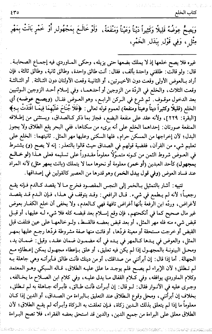 تَنْبِيهٌ: أَشَارَ بِالتَّمْثِيلِ بِالْخَمْرِ إلَى النَّجَسِ الْمَقْصُودِ فَخَرَجَ مَا لَا يُقْصَدُ كَالدَّمِ فَإِنَّهُ يَقَعُ رَجْعِيًّا؛ لِأَنَّهُ لَمْ يَطْمَعْ فِي شَيْءٍ. قَالَ الرَّافِعِيُّ: وَقَدْ يُتَوَقَّفُ فِي هَذَا، فَإِنَّ الدَّمَ قَدْ يُقْصَدُ لِأَغْرَاضٍ، وَرَدَّهُ ابْنُ الرِّفْعَةِ بِأَنَّهَا أَغْرَاضٌ تَافِهَةٌ فَهِيَ كَالْعَدَمِ، وَلَا يَخْفَى أَنَّ خُلْعَ الْكُفَّارِ بِعِوَضٍ غَيْرِ مَالٍ صَحِيحٌ كَمَا فِي أَنْكِحَتِهِمْ، فَإِنْ وَقَعَ إسْلَامٌ بَعْدَ قَبْضِهِ كُلِّهِ فَلَا شَيْءَ لَهُ عَلَيْهَا، أَوْ قَبْلَ قَبْضِ شَيْءٍ مِنْهُ فَلَهُ مَهْرُ الْمِثْلِ، أَوْ بَعْدَ قَبْضِ بَعْضِهِ فَالْقِسْطُ، وَلَوْ خَالَعَهَا عَلَى عَيْنٍ فَتَلِفَتْ قَبْلَ الْقَبْضِ أَوْ خَرَجَتْ مُسْتَحَقَّةً أَوْ مُعَيَّنَةً فَرَدَّهَا، أَوْ فَاتَتْ مِنْهَا صِفَةٌ مَشْرُوطَةٌ فَرَدَّهَا رَجَعَ عَلَيْهَا بِمَهْرِ الْمِثْلِ، وَالْعِوَضُ فِي يَدِهَا كَالْمَهْرِ فِي يَدِهِ فِي أَنَّهُ مَضْمُونٌ ضَمَانَ عَقْدٍ، وَقِيلَ: ضَمَانَ يَدٍ، وَمَحَلُّ الْبَيْنُونَةِ بِالْمَجْهُولِ إذَا لَمْ يَكُنْ فِيهِ تَعْلِيقٌ، أَوْ عُلِّقَ بِإِعْطَاءِ مَجْهُولٍ يُمْكِنُ إعْطَاؤُهُ مَعَ الْجَهَالَةِ. أَمَّا إذَا قَالَ: إنْ أَبْرَأْتِنِي مِنْ صَدَاقِك، أَوْ مِنْ دَيْنِك فَأَنْتِ طَالِقٌ فَأَبْرَأَتْهُ وَهِيَ جَاهِلَةٌ بِهِ لَمْ تَطْلُقْ؛ لِأَنَّ الْإِبْرَاءَ لَمْ يَصِحَّ فَلَمْ يُوجَدْ مَا عَلَّقَ عَلَيْهِ الطَّلَاقَ، قَالَهُ السُّبْكِيُّ وَهُوَ الْمُعْتَمَدُ وَكَلَامُ الْمَاوَرْدِيُّ يُوَافِقُهُ، وَفِي كَلَامِ الْقَفَّالِ مَا يَدُلُّ عَلَيْهِ، وَفِي كَلَامِ ابْنِ الصَّلَاحِ مَا يُخَالِفُهُ، وَجَرَى عَلَيْهِ فِي الْأَنْوَارِ فَقَالَ: لَوْ قَالَ: إنْ أَبْرَأْت فَأَنْتِ طَالِقٌ، فَأَنْتِ طَالِقٌ، فَأَبْرَأَتْهُ جَاهِلَةً بِهِ لَمْ تَطْلُقْ، بِخِلَافِ إنْ أَبْرَأْتِنِي، وَمَحَلُّ وُقُوعِ الطَّلَاقِ عِنْدَ التَّعْلِيقِ بِالْبَرَاءَةِ مِنْ الصَّدَاقِ، أَوْ الدَّيْنِ إذَا كَانَ مَعْلُومًا مَا إذَا لَمْ يَتَعَلَّقْ بِذَلِكَ الدَّيْنِ زَكَاةٌ، فَإِنْ تَعَلَّقَتْ بِهِ الزَّكَاةُ وَأَبْرَأَتْهُ لَمْ يَقَعْ الطَّلَاقُ؛ لِأَنَّ الطَّلَاقَ مُعَلَّقٌ عَلَى الْبَرَاءَةِ مِنْ جَمِيعِ الدَّيْنِ، وَالدَّيْنُ قَدْ اسْتَحَقَّ بَعْضَهُ الْفُقَرَاءُ، فَلَا تَصِحُّ الْبَرَاءَةُ