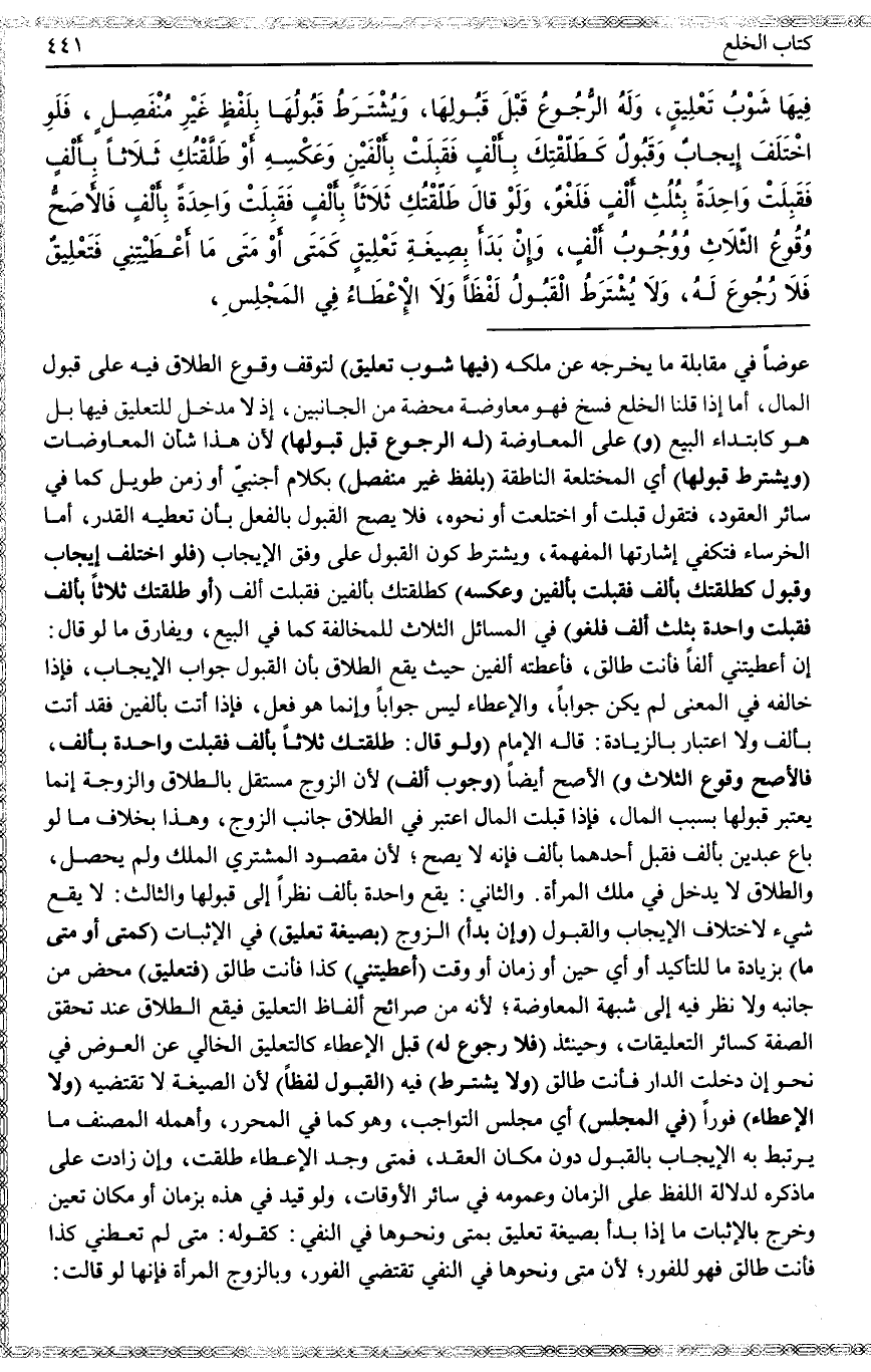 وَيُشْتَرَطُ كَوْنُ الْقَبُولِ عَلَى وَفْقِ الْإِيجَابِ (فَلَوْ اخْتَلَفَ إيجَابٌ وَقَبُولٌ كَطَلَّقْتُكِ بِأَلْفٍ فَقَبِلَتْ بِأَلْفَيْنِ وَعَكْسُهُ) كَطَلَّقْتُكِ بِأَلْفَيْنِ فَقَبِلَتْ بِأَلْفٍ (أَوْ طَلَّقْتُك ثَلَاثًا بِأَلْفٍ فَقَبِلَتْ وَاحِدَةً بِثُلُثِ أَلْفٍ فَلَغْوٌ) فِي الْمَسَائِلِ الثَّلَاثِ لِلْمُخَالَفَةِ كَمَا فِي الْبَيْعِ، وَيُفَارِقُ مَا لَوْ قَالَ: إنْ أَعْطَيْتِنِي أَلْفًا فَأَنْتِ طَالِقٌ، فَأَعْطَتْهُ أَلْفَيْنِ حَيْثُ يَقَعُ الطَّلَاقُ بِأَنَّ الْقَبُولَ جَوَابُ الْإِيجَابِ، فَإِذَا خَالَفَهُ فِي الْمَعْنَى لَمْ يَكُنْ جَوَابًا، وَالْإِعْطَاءُ لَيْسَ جَوَابًا وَإِنَّمَا هُوَ فِعْلٌ، فَإِذَا أَتَتْ بِأَلْفَيْنِ فَقَدْ أَتَتْ بِأَلْفٍ وَلَا اعْتِبَارَ بِالزِّيَادَةِ، قَالَهُ الْإِمَامُ (وَلَوْ قَالَ: طَلَّقْتُك ثَلَاثًا بِأَلْفٍ فَقَبِلَتْ وَاحِدَةً بِأَلْفٍ، فَالْأَصَحُّ وُقُوعُ الثَّلَاثِ وَ) الْأَصَحُّ أَيْضًا (وُجُوبُ أَلْفٍ) لِأَنَّ الزَّوْجَ مُسْتَقِلٌّ بِالطَّلَاقِ وَالزَّوْجَةُ إنَّمَا يُعْتَبَرُ قَبُولُهَا بِسَبَبِ الْمَالِ، فَإِذَا قَبِلَتْ الْمَالَ اُعْتُبِرَ فِي الطَّلَاقِ جَانِبُ الزَّوْجِ، وَهَذَا بِخِلَافِ مَا لَوْ بَاعَ عَبْدَيْنِ بِأَلْفٍ فَقَبِلَ أَحَدُهُمَا بِأَلْفٍ فَإِنَّهُ لَا يَصِحُّ؛ لِأَنَّ مَقْصُودَ الْمُشْتَرِي الْمِلْكُ وَلَمْ يَحْصُلْ، وَالطَّلَاقُ لَا يَدْخُلُ فِي مِلْكِ الْمَرْأَةِ. وَالثَّانِي: يَقَعُ وَاحِدَةً بِأَلْفٍ نَظَرًا إلَى قَبُولِهَا وَالثَّالِثُ: لَا يَقَعُ شَيْءٌ لِاخْتِلَافِ الْإِيجَابِ وَالْقَبُولِ.