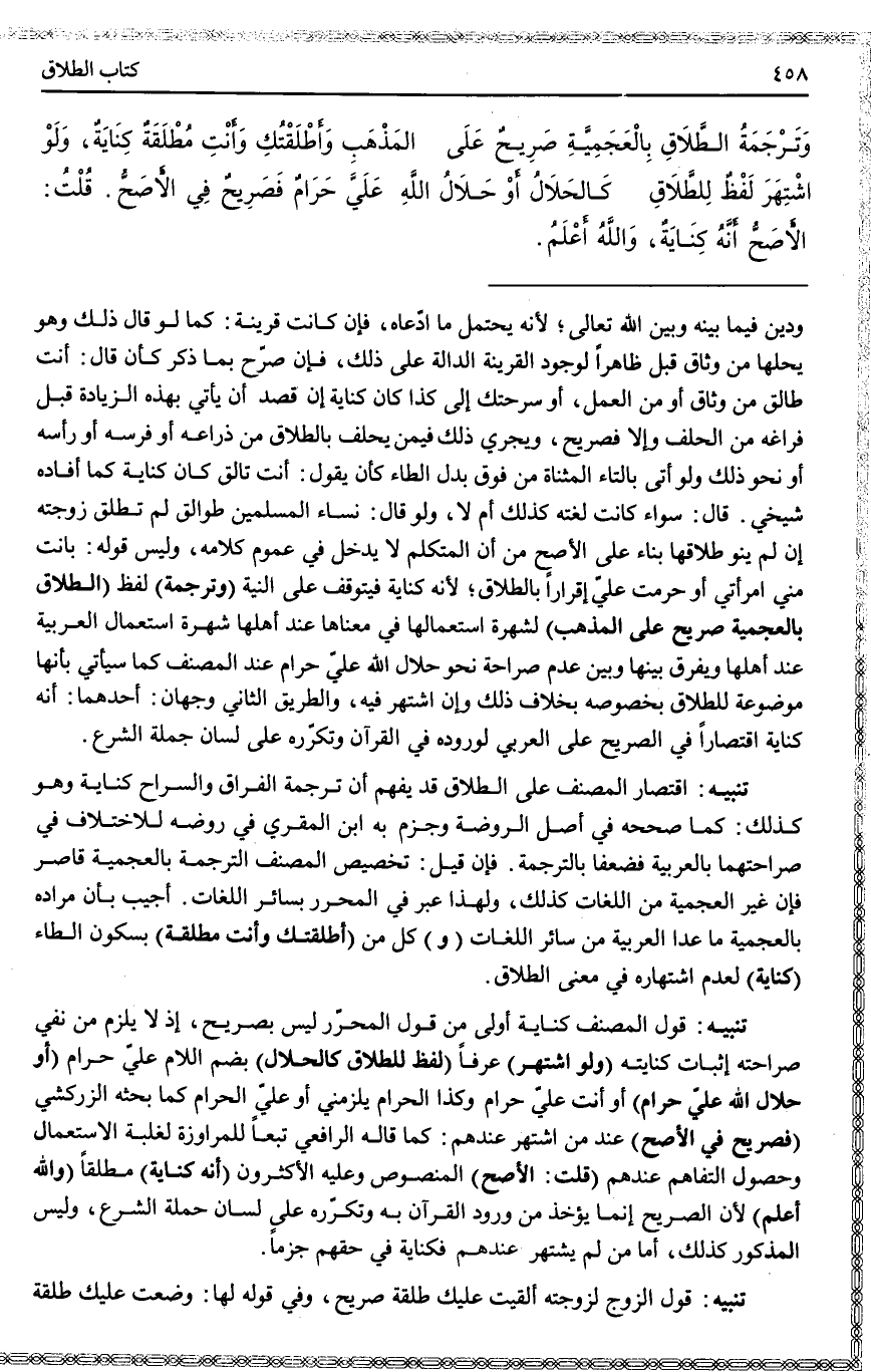 تَنْبِيهٌ: اقْتِصَارُ الْمُصَنِّفِ عَلَى الطَّلَاقِ قَدْ يُفْهِمُ أَنَّ تَرْجَمَةَ الْفِرَاقِ وَالسَّرَاحِ كِنَايَةٌ وَهُوَ كَذَلِكَ: كَمَا صَحَّحَهُ فِي أَصْلِ الرَّوْضَةِ وَجَزَمَ بِهِ ابْنُ الْمُقْرِي فِي رَوْضِهِ لِلِاخْتِلَافِ فِي صَرَاحَتِهِمَا بِالْعَرَبِيَّةِ فَضُعِّفَا بِالتَّرْجَمَةِ. فَإِنْ قِيلَ: تَخْصِيصُ الْمُصَنِّفِ التَّرْجَمَةَ بِالْعَجَمِيَّةِ قَاصِرٌ فَإِنَّ غَيْرَ الْعَجَمِيَّةِ مِنْ اللُّغَاتِ كَذَلِكَ، وَلِهَذَا عَبَّرَ فِي الْمُحَرَّرِ بِسَائِرِ اللُّغَاتِ.