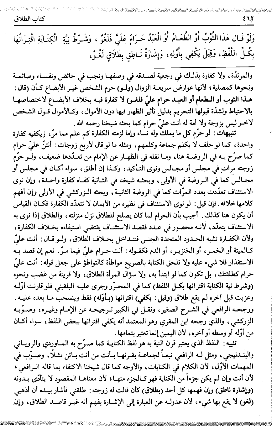 تَنْبِيهَاتٌ: لَوْ حَرَّمَ كُلُّ مَا يَمْلِكُ وَلَهُ نِسَاءٌ وَإِمَاءٌ لَزِمَتْهُ الْكَفَّارَةُ كَمَا عُلِمَ مِمَّا مَرَّ، وَيَكْفِيهِ كَفَّارَةٌ وَاحِدَةٌ، كَمَا لَوْ حَلَفَ لَا يُكَلِّمُ جَمَاعَةً وَكَلَّمَهُمْ، وَمِثْلُهُ مَا لَوْ قَالَ لِأَرْبَعِ زَوْجَاتٍ: أَنْتُنَّ عَلَيَّ حَرَامٌ كَمَا صَرَّحَ بِهِ فِي الرَّوْضَةِ هُنَا، وَمَا نَقَلَهُ فِي الظِّهَارِ عَنْ الْإِمَامِ مِنْ تَعَدُّدِهَا ضَعِيفٌ، وَلَوْ حَرَّمَ زَوْجَتَهُ مَرَّاتٍ فِي مَجْلِسٍ أَوْ مَجَالِسَ وَنَوَى التَّأْكِيدَ، وَكَذَا إنْ أَطْلَقَ، سَوَاءٌ أَكَانَ فِي مَجْلِسٍ أَوْ مَجَالِسَ كَمَا فِي الرَّوْضَةِ فِي الْأُولَى، وَبَحَثَهُ شَيْخُنَا فِي الثَّانِيَةِ كَفَاهُ كَفَّارَةٌ وَاحِدَةٌ، وَإِنْ نَوَى الِاسْتِئْنَافَ تَعَدَّدَتْ بِعَدَدِ الْمَرَّاتِ كَمَا فِي الرَّوْضَةِ فِي الثَّانِيَةِ، وَبَحَثَهُ الزَّرْكَشِيُّ فِي الْأُولَى وَإِنْ أَفْهَمَ كَلَامُهَا خِلَافَهُ. فَإِنْ قِيلَ: لَوْ نَوَى الِاسْتِئْنَافَ فِي نَظِيرِهِ مِنْ الْأَيْمَانِ لَا تَتَعَدَّدُ الْكَفَّارَةُ فَكَانَ الْقِيَاسُ أَنْ يَكُونَ هُنَا كَذَلِكَ.
