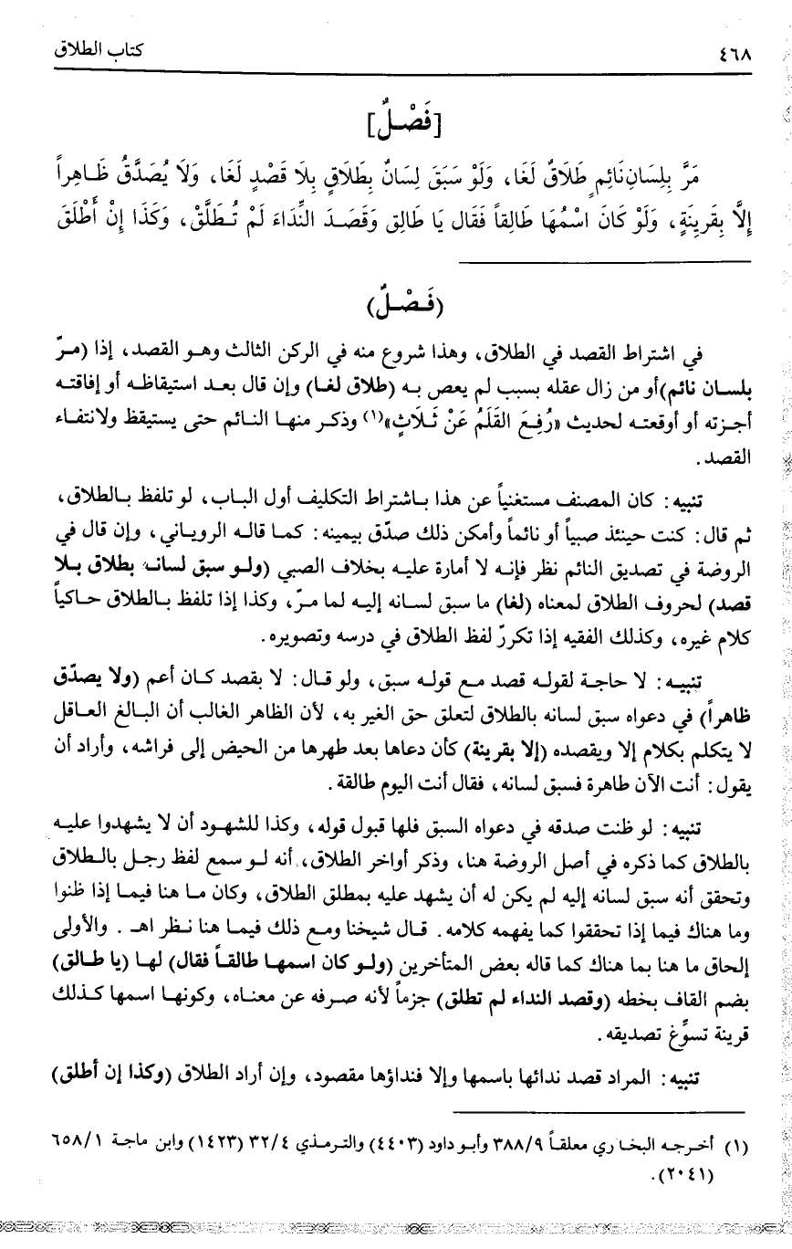 (فَصْلٌ) فِي اشْتِرَاطِ الْقَصْدِ فِي الطَّلَاقِ، وَهَذَا شُرُوعٌ مِنْهُ فِي الرُّكْنِ الثَّالِثِ وَهُوَ الْقَصْدُ، إذَا (مَرَّ بِلِسَانِ نَائِمٍ) أَوْ مَنْ زَالَ عَقْلُهُ بِسَبَبٍ لَمْ يَعْصِ بِهِ (طَلَاقٌ لَغَا) وَإِنْ قَالَ بَعْدَ اسْتِيقَاظِهِ أَوْ إفَاقَتِهِ أَجَزْتُهُ أَوْ أَوْقَعْتُهُ لِحَدِيثِ «رُفِعَ الْقَلَمُ عَنْ ثَلَاثٍ» وَذَكَرَ مِنْهَا النَّائِمَ حَتَّى يَسْتَيْقِظَ وَلِانْتِفَاءِ الْقَصْدِ.