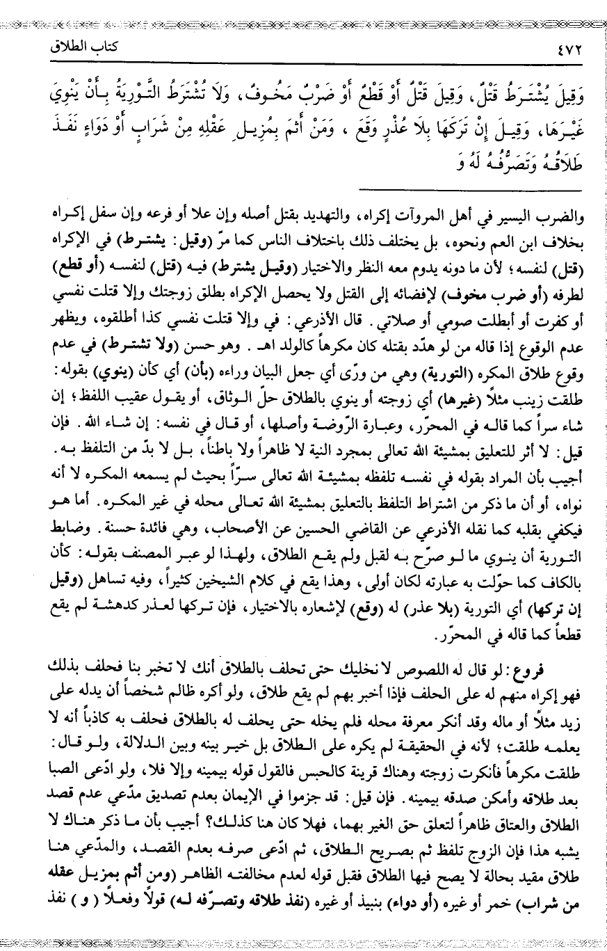 (وَلَا تُشْتَرَطُ) فِي عَدَمِ وُقُوعِ طَلَاقِ الْمُكْرَهِ (التَّوْرِيَةُ) وَهِيَ مِنْ وَرَى أَيْ جَعَلَ الْبَيَانَ وَرَاءَهُ (بِأَنْ) أَيْ كَأَنْ (يَنْوِيَ) بِقَوْلِهِ: طَلَّقْت زَيْنَبَ مَثَلًا (غَيْرَهَا) أَيْ زَوْجَتَهُ أَوْ يَنْوِي بِالطَّلَاقِ حَلَّ الْوِثَاقِ، أَوْ يَقُولُ عَقِيبَ اللَّفْظِ؛ إنْ شَاءَ سِرًّا كَمَا قَالَهُ فِي الْمُحَرَّرِ، وَعِبَارَةُ الرَّوْضَةِ وَأَصْلُهَا، أَوْ قَالَ فِي نَفْسِهِ: إنْ شَاءَ اللَّهُ. فَإِنْ قِيلَ: لَا أَثَرَ لِلتَّعْلِيقِ بِمَشِيئَةِ اللَّهِ تَعَالَى بِمُجَرَّدِ النِّيَّةِ لَا ظَاهِرًا وَلَا بَاطِنًا، بَلْ لَا بُدَّ مِنْ التَّلَفُّظِ بِهِ.