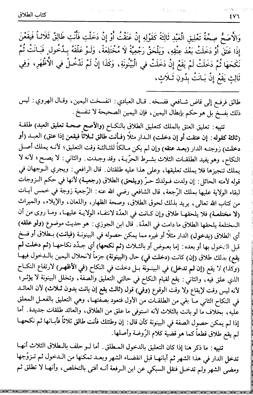 تَنْبِيهٌ: تَعْلِيقُ الْعِتْقِ بِالْمِلْكِ كَتَعْلِيقِ الطَّلَاقِ بِالنِّكَاحِ (وَالْأَصَحُّ صِحَّةُ تَعْلِيقِ الْعَبْدِ) طَلْقَةً (ثَالِثَةً كَقَوْلِهِ: إنْ عَتَقْت أَوْ إنْ دَخَلْت) الدَّارَ مَثَلًا (فَأَنْتِ طَالِقٌ ثَلَاثًا فَيَقَعْنَ إذَا عَتَقَ) الْعَبْدُ (أَوْ دَخَلَتْ) زَوْجَتُهُ الدَّارَ (بَعْدَ عِتْقِهِ) وَإِنْ لَمْ يَكُنْ مَالِكًا لِلثَّالِثَةِ وَقْتَ التَّعْلِيقِ؛ لِأَنَّهُ يَمْلِكُ أَصْلَ النِّكَاحِ، وَهُوَ يُفِيدُ الطَّلْقَاتِ الثَّلَاثَ بِشَرْطِ الْحُرِّيَّةِ، وَقَدْ وُجِدَتْ. وَالثَّانِي: لَا يَصِحُّ؛ لِأَنَّهُ لَا يَمْلِكُ تَنْجِيزَهَا فَلَا يَمْلِكُ تَعْلِيقَهَا، وَعَلَى هَذَا عَلَيْهِ طَلْقَتَانِ. قَالَ الرَّافِعِيُّ: وَيَجْرِي الْوَجْهَانِ فِي قَوْلِهِ لِأَمَتِهِ الْحَائِلِ: إنْ وَلَدْت فَوَلَدُك حُرٌّ.