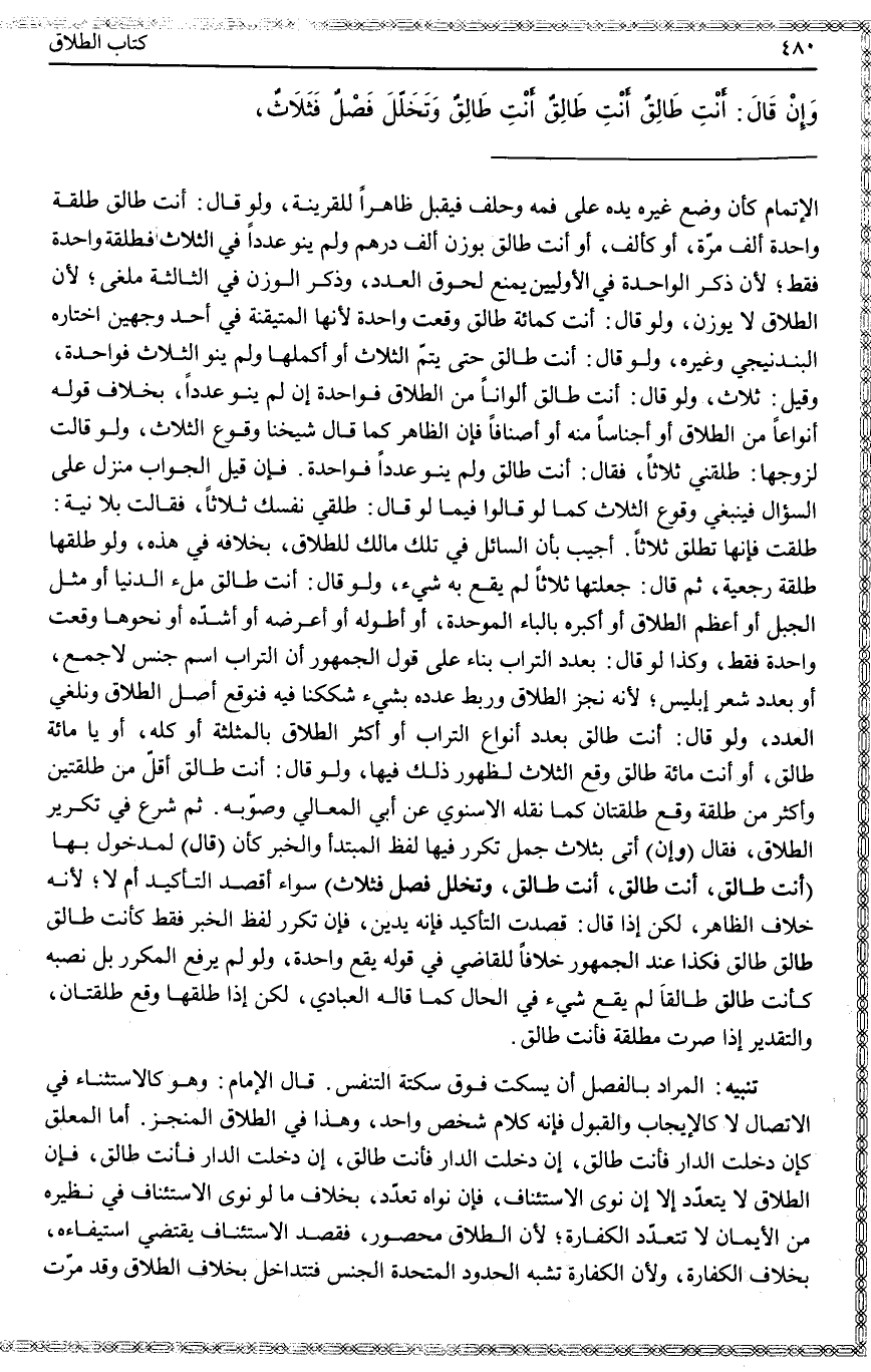 تَنْبِيهٌ: الْمُرَادُ بِالْفَصْلِ أَنْ يَسْكُتَ فَوْقَ سَكْتَةِ التَّنَفُّسِ. قَالَ الْإِمَامُ: وَهُوَ كَالِاسْتِثْنَاءِ فِي الِاتِّصَالِ لَا كَالْإِيجَابِ وَالْقَبُولِ فَإِنَّهُ كَلَامُ شَخْصٍ وَاحِدٍ، وَهَذَا فِي الطَّلَاقِ الْمُنَجَّزِ. أَمَّا الْمُعَلَّقِ كَإِنْ دَخَلْت الدَّارَ فَأَنْتِ طَالِقٌ، إنْ دَخَلْت الدَّارَ فَأَنْتِ طَالِقٌ، إنْ دَخَلْت الدَّارَ فَأَنْتِ طَالِقٌ، فَإِنَّ الطَّلَاقَ لَا يَتَعَدَّدُ إلَّا إنْ نَوَى الِاسْتِئْنَافَ، فَإِنْ نَوَاهُ تَعَدَّدَ، بِخِلَافِ مَا لَوْ نَوَى الِاسْتِئْنَافَ فِي نَظِيرِهِ مِنْ الْأَيْمَانِ لَا تَتَعَدَّدُ الْكَفَّارَةُ؛ لِأَنَّ الطَّلَاقَ مَحْصُورٌ، فَقَصْدُ الِاسْتِئْنَافِ يَقْتَضِي اسْتِيفَاءَهُ، بِخِلَافِ الْكَفَّارَةِ؛ وَلِأَنَّ الْكَفَّارَةَ تُشْبِهُ الْحُدُودَ الْمُتَّحِدَةَ الْجِنْسِ فَتَتَدَاخَلُ بِخِلَافِ الطَّلَاقِ وَقَدْ مَرَّتْ