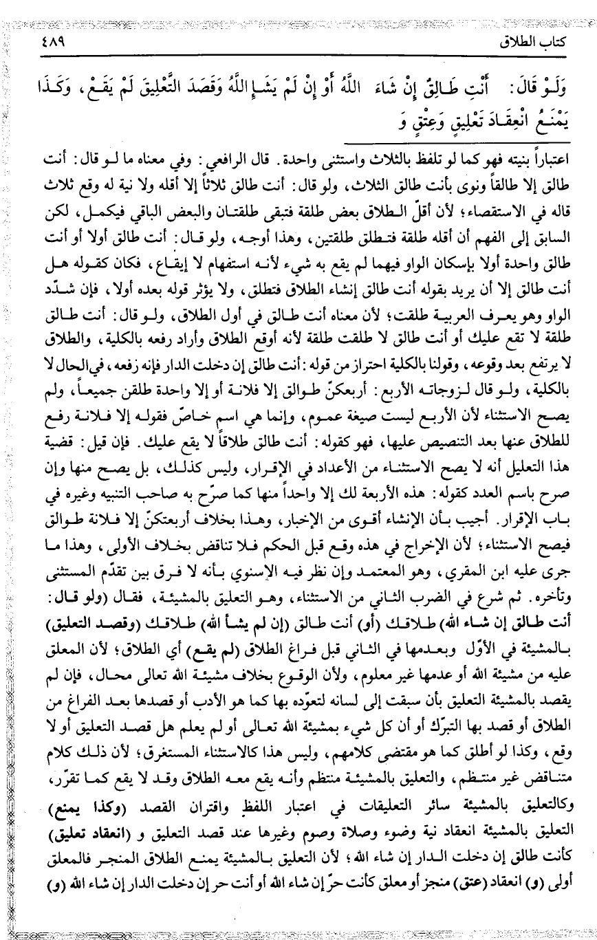 ثُمَّ شَرَعَ فِي الضَّرْبِ الثَّانِي مِنْ الِاسْتِثْنَاءِ، وَهُوَ التَّعْلِيقُ بِالْمَشِيئَةِ، فَقَالَ (وَلَوْ قَالَ: أَنْتِ طَالِقٌ إنْ شَاءَ اللَّهُ) طَلَاقَك (أَوْ) أَنْتِ طَالِقٌ (إنْ لَمْ يَشَأْ اللَّهُ) طَلَاقَك (وَقَصَدَ التَّعْلِيقَ) بِالْمَشِيئَةِ فِي الْأَوَّلِ وَبِعَدَمِهَا فِي الثَّانِي قَبْلَ فَرَاغِ الطَّلَاقِ (لَمْ يَقَعْ) أَيْ الطَّلَاقُ؛ لِأَنَّ الْمُعَلَّقَ عَلَيْهِ مِنْ مَشِيئَةِ اللَّهِ أَوْ عَدَمِهَا غَيْرُ مَعْلُومٍ؛ وَلِأَنَّ الْوُقُوعَ بِخِلَافِ مَشِيئَةِ اللَّهِ تَعَالَى مُحَالٌ، فَإِنْ لَمْ يَقْصِدْ بِالْمَشِيئَةِ التَّعْلِيقَ بِأَنْ سَبَقَتْ إلَى لِسَانِهِ لِتَعَوُّدِهِ بِهَا كَمَا هُوَ الْأَدَبُ أَوْ قَصَدَهَا بَعْدَ الْفَرَاغِ مِنْ الطَّلَاقِ أَوْ قَصَدَ بِهَا التَّبَرُّكَ أَوْ أَنَّ كُلَّ شَيْءٍ بِمَشِيئَةِ اللَّهِ تَعَالَى أَوْ لَمْ يَعْلَمْ هَلْ قَصَدَ التَّعْلِيقَ أَوْ لَا وَقَعَ، وَكَذَا لَوْ أَطْلَقَ كَمَا هُوَ مُقْتَضَى كَلَامِهِمْ، وَلَيْسَ هَذَا كَالِاسْتِثْنَاءِ الْمُسْتَغْرِقِ؛ لِأَنَّ ذَلِكَ كَلَامٌ مُتَنَاقِضٌ غَيْرُ مُنْتَظِمٍ، وَالتَّعْلِيقُ بِالْمَشِيئَةِ مُنْتَظِمٌ وَأَنَّهُ يَقَعُ مَعَهُ الطَّلَاقُ وَقَدْ لَا يَقَعُ كَمَا تَقَرَّرَ، وَكَالتَّعْلِيقِ بِالْمَشِيئَةِ سَائِرُ التَّعْلِيقَاتِ فِي اعْتِبَارِ اللَّفْظِ وَاقْتِرَانِ الْقَصْدِ (وَكَذَا يَمْنَعُ) التَّعْلِيقُ بِالْمَشِيئَةِ انْعِقَادَ نِيَّةِ وُضُوءٍ وَصَلَاةٍ وَصَوْمٍ وَغَيْرِهَا عِنْدَ قَصْدِ التَّعْلِيقِ وَ (انْعِقَادَ تَعْلِيقٍ) كَأَنْتِ طَالِقٌ إنْ دَخَلْت الدَّارَ إنْ شَاءَ اللَّهُ؛ لِأَنَّ التَّعْلِيقَ بِالْمَشِيئَةِ يَمْنَعُ الطَّلَاقَ الْمُنَجَّزَ فَالْمُعَلَّقُ أَوْلَى (وَ) انْعِقَادَ (عِتْقٍ) مُنَجَّزٍ أَوْ مُعَلَّقٍ كَأَنْتِ حُرٌّ إنْ شَاءَ اللَّهُ أَوْ أَنْتَ حُرٌّ إنْ دَخَلْت الدَّارَ إنْ شَاءَ اللَّهُ (وَ)