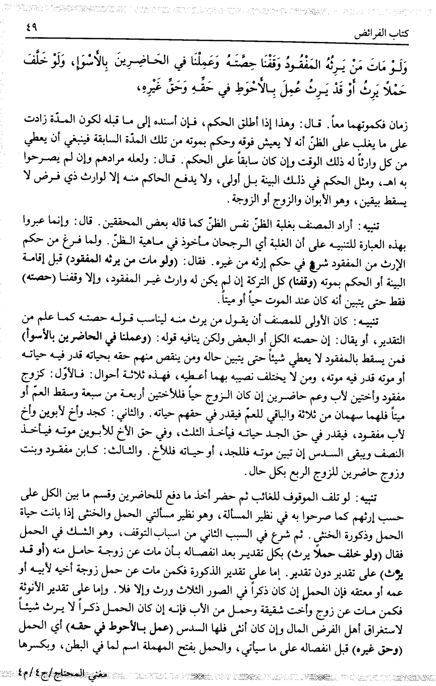 تَنْبِيهٌ: كَانَ الْأَوْلَى لِلْمُصَنِّفِ أَنْ يَقُولَ مَنْ يَرِثُ مِنْهُ لِيُنَاسِبَ قَوْلَهُ حِصَّتَهُ كَمَا عُلِمَ مِنْ التَّقْدِيرِ، أَوْ يُقَالَ: إنَّ حِصَّتَهُ الْكُلُّ أَوْ الْبَعْضُ وَلَكِنْ يُنَافِيهِ قَوْلُهُ: (وَعَمِلْنَا فِي الْحَاضِرِينَ بِالْأَسْوَأِ) فَمَنْ يَسْقُطُ بِالْمَفْقُودِ لَا يُعْطَى شَيْئًا حَتَّى يَتَبَيَّنَ حَالُهُ وَمَنْ يَنْقُصُ مِنْهُمْ حَقُّهُ بِحَيَاتِهِ أَوْ مَوْتِهِ قُدِّرَ فِيهِ مَوْتُهُ، وَمَنْ لَا يَخْتَلِفُ نَصِيبُهُ بِهِمَا أُعْطِيَهُ، فَهَذِهِ ثَلَاثَةُ أَحْوَالٍ: فَالْأَوَّلُ: كَزَوْجٍ مَفْقُودٍ وَأُخْتَيْنِ لِأَبٍ وَعَمٍّ حَاضِرِينَ إنْ كَانَ الزَّوْجُ حَيًّا فَلِلْأُخْتَيْنِ أَرْبَعَةٌ مِنْ سَبْعَةٍ وَسَقَطَ الْعَمُّ أَوْ مَيِّتًا فَلَهُمَا سَهْمَانِ مِنْ ثَلَاثَةٍ وَالْبَاقِي لِلْعَمِّ فَيُقَدَّرُ فِي حَقِّهِمْ حَيَاتُهُ.