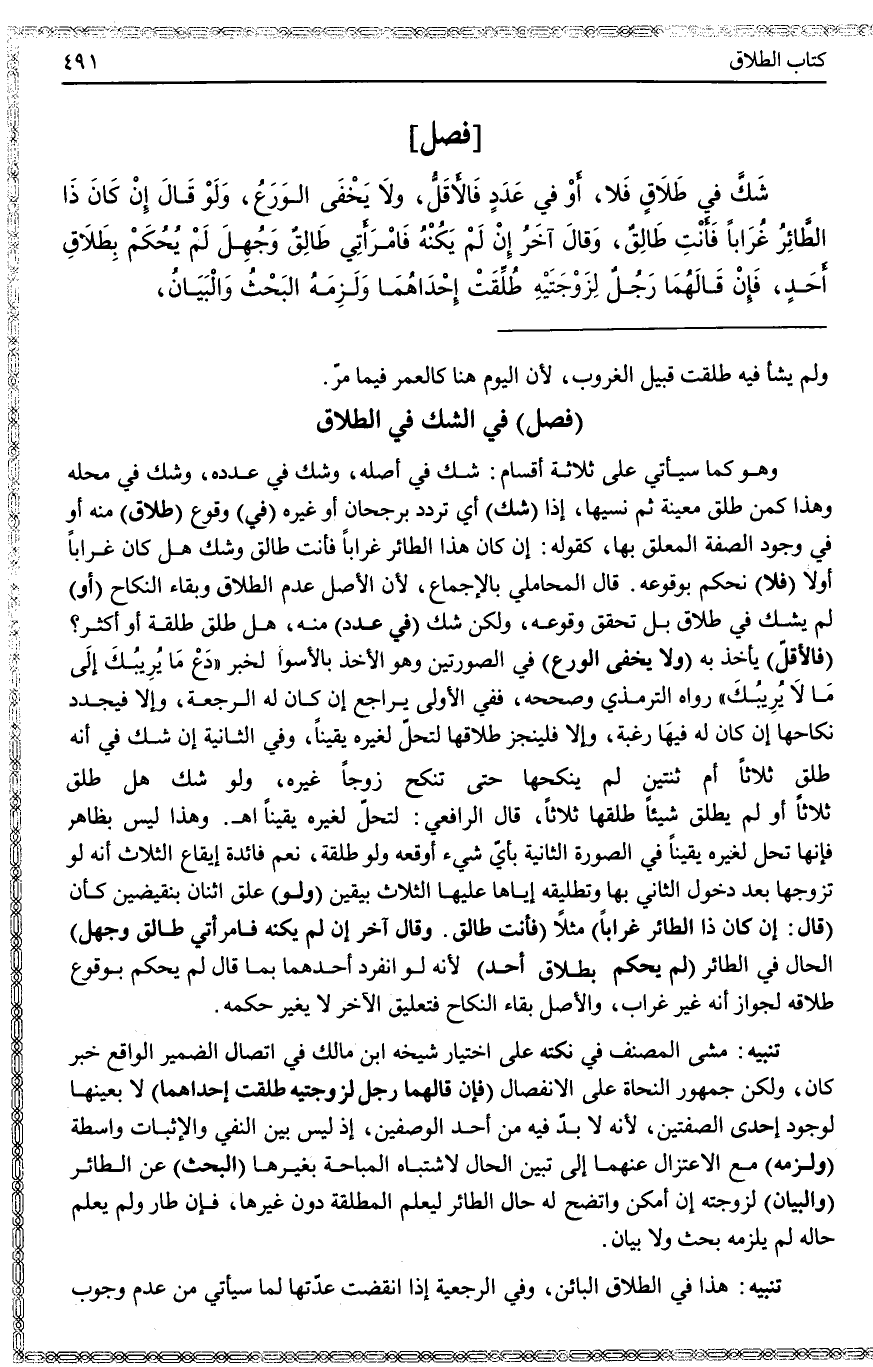 (فَصْلٌ) فِي الشَّكِّ فِي الطَّلَاقِ وَهُوَ كَمَا سَيَأْتِي عَلَى ثَلَاثَةِ أَقْسَامٍ: شَكٌّ فِي أَصْلِهِ، وَشَكٌّ فِي عَدَدِهِ، وَشَكٌّ فِي مَحَلِّهِ وَهَذَا كَمَنْ طَلَّقَ مُعَيَّنَةً ثُمَّ نَسِيَهَا، إذَا (شَكَّ) أَيْ تَرَدَّدَ بِرُجْحَانٍ أَوْ غَيْرِهِ (فِي) وُقُوعِ (طَلَاقٍ) مِنْهُ أَوْ فِي وُجُودِ الصِّفَةِ الْمُعَلَّقِ بِهَا، كَقَوْلِهِ: إنْ كَانَ هَذَا الطَّائِرُ غُرَابًا فَأَنْتِ طَالِقٌ وَشَكَّ هَلْ كَانَ غُرَابًا أَوْ لَا (فَلَا) نَحْكُمُ بِوُقُوعِهِ. قَالَ الْمَحَامِلِيُّ بِالْإِجْمَاعِ؛ لِأَنَّ الْأَصْلَ عَدَمُ الطَّلَاقِ وَبَقَاءُ النِّكَاحِ (أَوْ) لَمْ يَشُكَّ فِي طَلَاقٍ بَلْ تَحَقَّقَ وُقُوعَهُ، وَلَكِنْ شَكَّ (فِي عَدَدٍ) مِنْهُ، هَلْ طَلَّقَ طَلْقَةً أَوْ أَكْثَرَ؟ (فَالْأَقَلُّ) يَأْخُذُ بِهِ (وَلَا يَخْفَى الْوَرَعُ) فِي الصُّورَتَيْنِ وَهُوَ الْأَخْذُ بِالْأَسْوَأِ لِخَبَرِ «دَعْ مَا يَرِيبُكَ إلَى مَا لَا يَرِيبُكَ» رَوَاهُ التِّرْمِذِيُّ وَصَحَّحَهُ، فَفِي الْأُولَى يُرَاجِعُ إنْ كَانَ لَهُ الرَّجْعَةُ، وَإِلَّا فَيُجَدِّدُ نِكَاحَهَا إنْ كَانَ لَهُ فِيهَا رَغْبَةٌ، وَإِلَّا فَلْيُنَجِّزْ طَلَاقَهَا لِتَحِلَّ لِغَيْرِهِ يَقِينًا، وَفِي الثَّانِيَةِ إنْ شَكَّ فِي أَنَّهُ طَلَّقَ ثَلَاثًا أَمْ ثِنْتَيْنِ لَمْ يَنْكِحْهَا حَتَّى تَنْكِحَ زَوْجًا غَيْرَهُ، وَلَوْ شَكَّ هَلْ طَلَّقَ ثَلَاثًا أَوْ لَمْ يُطَلِّقْ شَيْئًا طَلَّقَهَا ثَلَاثًا، قَالَ الرَّافِعِيُّ: لِتَحِلَّ لِغَيْرِهِ يَقِينًا اهـ.