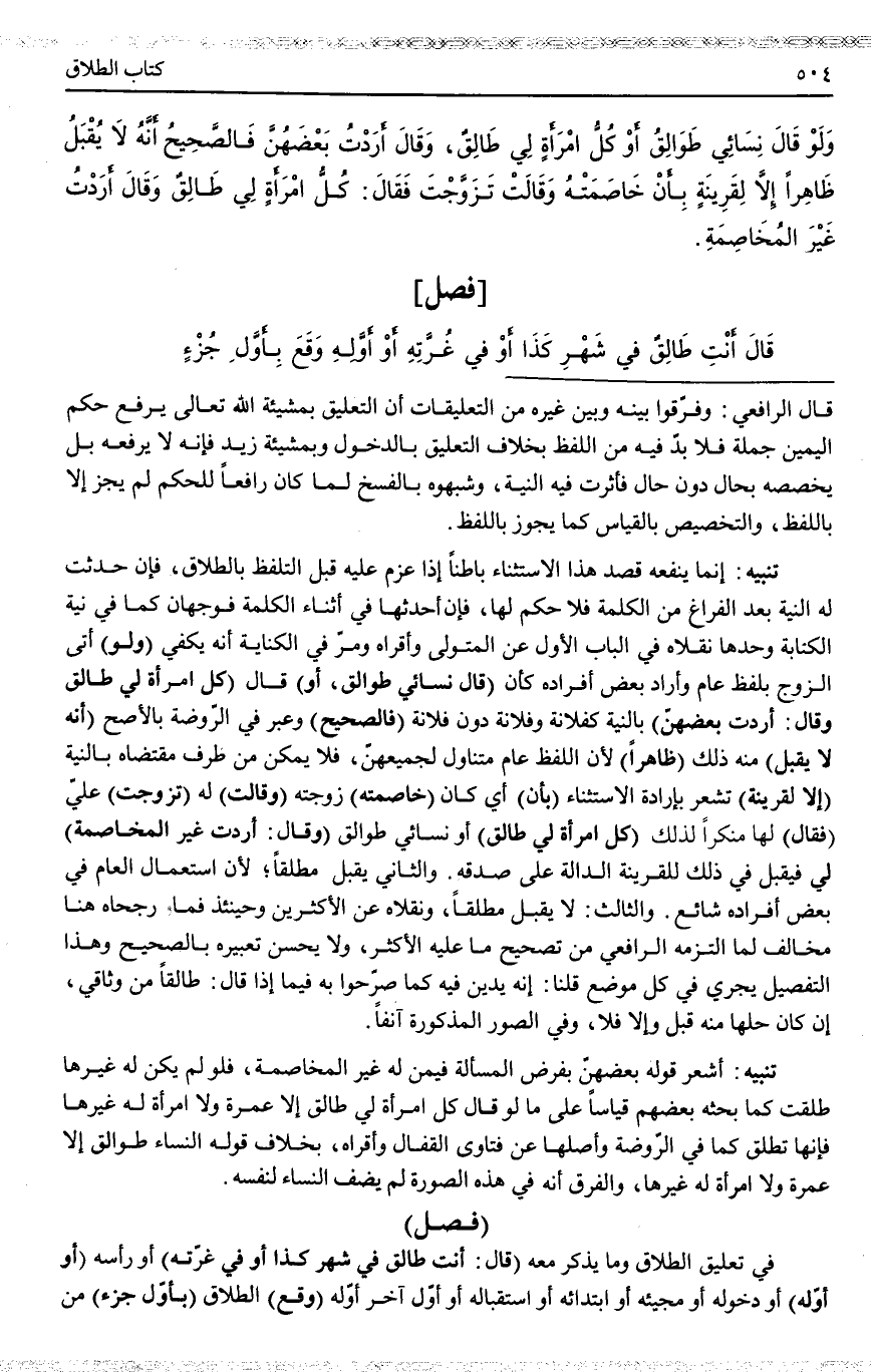(وَلَوْ) أَتَى الزَّوْجُ بِلَفْظٍ عَامٍّ وَأَرَادَ بَعْضَ أَفْرَادِهِ كَأَنْ (قَالَ نِسَائِي طَوَالِقُ، أَوْ) قَالَ (كُلُّ امْرَأَةٍ لِي طَالِقٌ وَقَالَ: أَرَدْت بَعْضَهُنَّ) بِالنِّيَّةِ كَفُلَانَةَ وَفُلَانَةُ دُونَ فُلَانَةَ (فَالصَّحِيحُ) وَعَبَّرَ فِي الرَّوْضَةِ بِالْأَصَحِّ (أَنَّهُ لَا يُقْبَلُ) مِنْهُ ذَلِكَ (ظَاهِرًا) لِأَنَّ اللَّفْظَ عَامٌّ مُتَنَاوَلٌ لِجَمِيعِهِنَّ، فَلَا يُمْكِنُ مِنْ ظَرْفٍ مُقْتَضَاهُ بِالنِّيَّةِ (إلَّا لِقَرِينَةٍ) تُشْعِرُ بِإِرَادَةِ الِاسْتِثْنَاءِ (بِأَنْ) أَيْ كَأَنْ (خَاصَمَتْهُ) زَوْجَتُهُ (وَقَالَتْ) لَهُ (تَزَوَّجْت) عَلَيَّ (فَقَالَ) لَهَا مُنْكِرًا لِذَلِكَ (كُلُّ امْرَأَةٍ لِي طَالِقٌ) أَوْ نِسَائِي طَوَالِقُ (وَقَالَ: أَرَدْت غَيْرَ الْمُخَاصَمَةِ) لِي فَيُقْبَلُ فِي ذَلِكَ لِلْقَرِينَةِ الدَّالَّةِ عَلَى صِدْقِهِ. وَالثَّانِي يُقْبَلُ مُطْلَقًا؛ لِأَنَّ اسْتِعْمَالَ الْعَامِّ فِي بَعْضِ أَفْرَادِهِ شَائِعٌ. وَالثَّالِثُ: لَا يُقْبَلُ مُطْلَقًا، وَنَقَلَاهُ عَنْ الْأَكْثَرِينَ وَحِينَئِذٍ فَمَا رَجَّحَاهُ هُنَا مُخَالِفٌ لِمَا الْتَزَمَهُ الرَّافِعِيُّ مِنْ تَصْحِيحِ مَا عَلَيْهِ الْأَكْثَرُ، وَلَا يَحْسُنُ تَعْبِيرُهُ بِالصَّحِيحِ وَهَذَا التَّفْصِيلُ يَجْرِي فِي كُلِّ مَوْضِعٍ قُلْنَا: إنَّهُ يُدَيَّنُ فِيهِ كَمَا صَرَّحُوا بِهِ فِيمَا إذَا قَالَ: طَالِقًا مِنْ وِثَاقِي، إنْ كَانَ حَلَّهَا مِنْهُ قَبْلُ وَإِلَّا فَلَا، وَفِي الصُّوَرِ الْمَذْكُورَةِ آنِفًا.