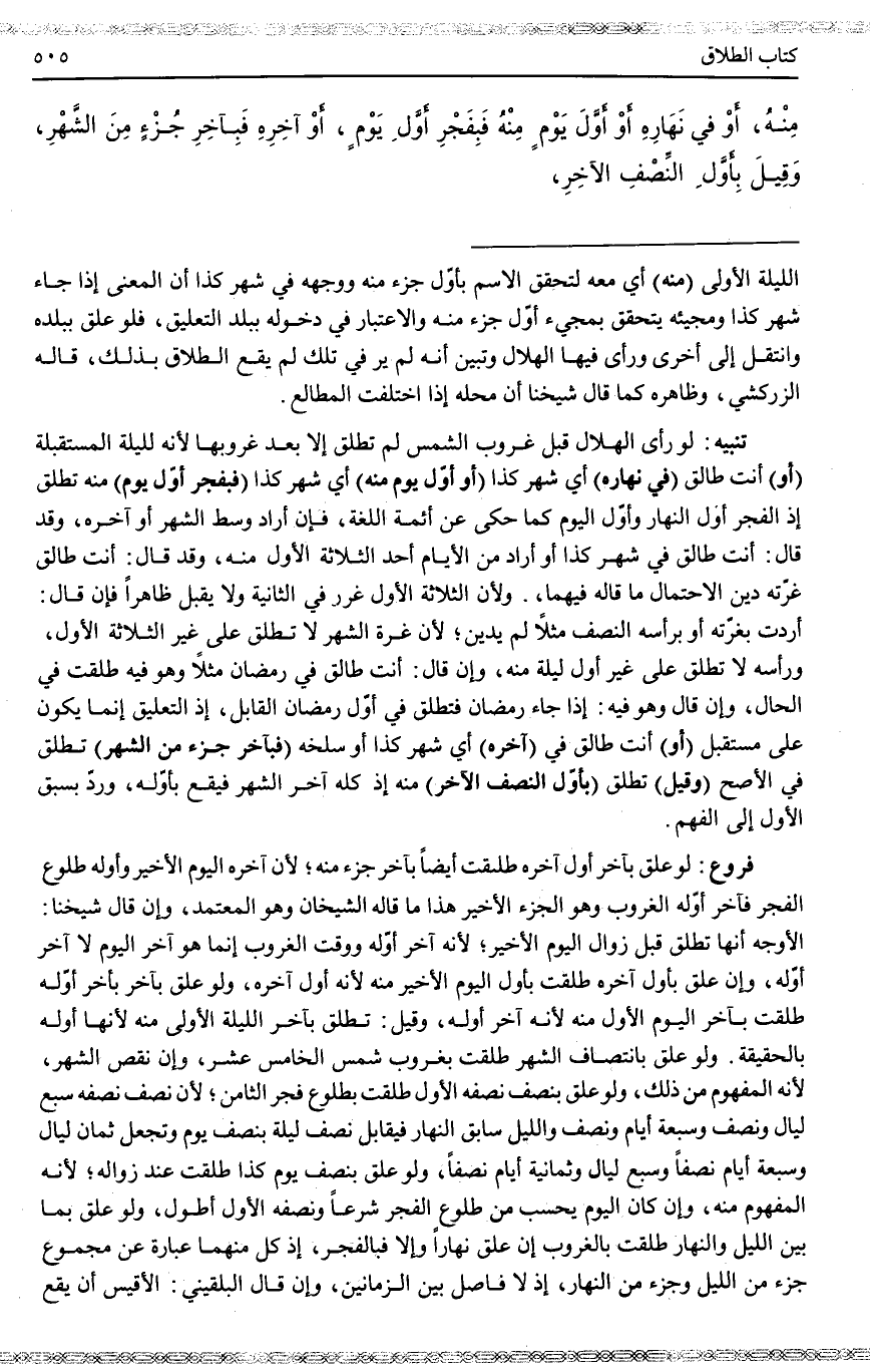 فُرُوعٌ: لَوْ عَلَّقَ بِآخِرِ أَوَّلِ آخِرِهِ طَلُقَتْ أَيْضًا بِآخِرِ جُزْءٍ مِنْهُ؛ لِأَنَّ آخِرَهُ الْيَوْمُ الْأَخِيرُ وَأَوَّلَهُ طُلُوعُ الْفَجْرِ فَآخِرُ أَوَّلِهِ الْغُرُوبُ وَهُوَ الْجُزْءُ الْأَخِيرُ هَذَا مَا قَالَهُ الشَّيْخَانِ وَهُوَ الْمُعْتَمَدُ، وَإِنْ قَالَ شَيْخُنَا: الْأَوْجَهُ أَنَّهَا تَطْلُقُ قَبْلَ زَوَالِ الْيَوْمِ الْأَخِيرِ؛ لِأَنَّهُ آخِرُ أَوَّلِهِ وَوَقْتُ الْغُرُوبِ إنَّمَا هُوَ آخِرُ الْيَوْمِ لَا آخِرُ أَوَّلِهِ، وَإِنْ عَلَّقَ بِأَوَّلِ آخِرِهِ طَلُقَتْ بِأَوَّلِ الْيَوْمِ الْأَخِيرِ مِنْهُ لِأَنَّهُ أَوَّلُ آخِرِهِ، وَلَوْ عَلَّقَ بِآخِرِ أَوَّلِهِ طَلُقَتْ بِآخِرِ الْيَوْمِ الْأَوَّلِ مِنْهُ لِأَنَّهُ آخِرُ أَوَّلِهِ، وَقِيلَ: تَطْلُقُ بِآخِرِ اللَّيْلَةِ الْأُولَى مِنْهُ لِأَنَّهَا أَوَّلُهُ بِالْحَقِيقَةِ. وَلَوْ عَلَّقَ بِانْتِصَافِ الشَّهْرِ طَلُقَتْ بِغُرُوبِ شَمْسِ الْخَامِسَ عَشَرَ، وَإِنْ نَقَصَ الشَّهْرُ؛ لِأَنَّهُ الْمَفْهُومُ مِنْ ذَلِكَ، وَلَوْ عَلَّقَ بِنِصْفِ نِصْفِهِ الْأَوَّلِ طَلُقَتْ بِطُلُوعِ فَجْرِ الثَّامِنِ؛ لِأَنَّ نِصْفَ نِصْفِهِ سَبْعُ لَيَالٍ وَنِصْفٌ وَسَبْعَةُ أَيَّامٍ وَنِصْفٌ وَاللَّيْلُ سَابِقُ النَّهَارِ فَيُقَابِلُ نِصْفَ لَيْلَةٍ بِنِصْفِ يَوْمٍ وَتُجْعَلُ ثَمَانِ لَيَالٍ وَسَبْعَةُ أَيَّامٍ نِصْفًا وَسَبْعُ لَيَالٍ وَثَمَانِيَةُ أَيَّامٍ نِصْفًا، وَلَوْ عَلَّقَ بِنِصْفِ يَوْمٍ كَذَا طَلُقَتْ عِنْدَ زَوَالِهِ؛ لِأَنَّهُ الْمَفْهُومُ مِنْهُ، وَإِنْ كَانَ الْيَوْمُ يُحْسَبُ مِنْ طُلُوعِ الْفَجْرِ شَرْعًا وَنِصْفُهُ الْأَوَّلُ أَطْوَلُ، وَلَوْ عَلَّقَ بِمَا بَيْنَ اللَّيْلِ وَالنَّهَارِ طَلُقَتْ بِالْغُرُوبِ إنْ عَلَّقَ نَهَارًا وَإِلَّا فَبِالْفَجْرِ، إذْ كُلٌّ مِنْهُمَا عِبَارَةٌ عَنْ مَجْمُوعِ جُزْءٍ مِنْ اللَّيْلِ وَجُزْءٍ مِنْ النَّهَارِ، إذْ لَا فَاصِلَ بَيْنَ الزَّمَانَيْنِ، وَإِنْ قَالَ الْبُلْقِينِيُّ: الْأَقْيَسُ أَنْ يَقَعَ