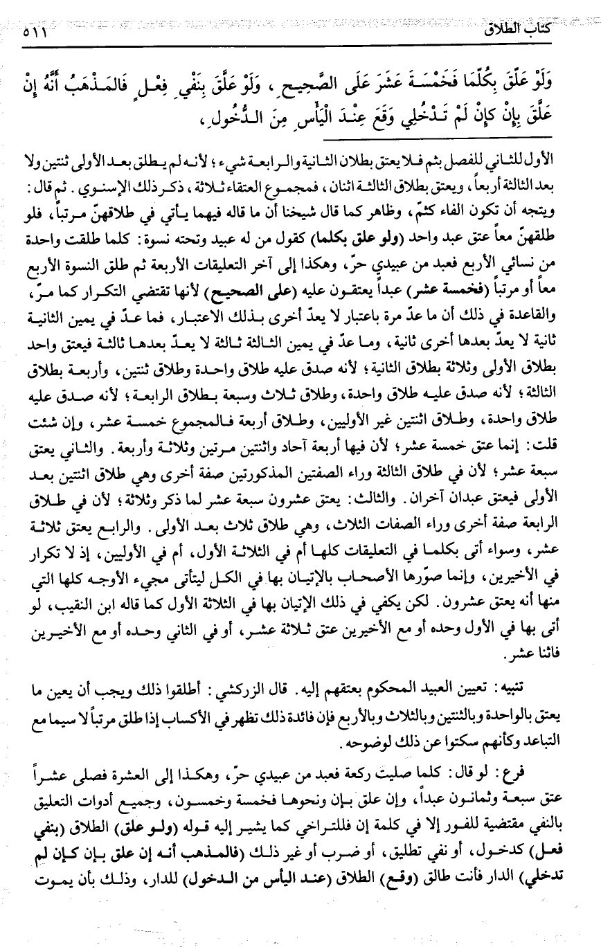 (وَلَوْ عَلَّقَ) الطَّلَاقَ (بِنَفْيِ فِعْلٍ) كَدُخُولٍ، أَوْ نَفْيِ تَطْلِيقٍ، أَوْ ضَرْبٍ أَوْ غَيْرِ ذَلِكَ (فَالْمَذْهَبُ أَنَّهُ إنْ عَلَّقَ بِإِنْ كَإِنْ لَمْ تَدْخُلِي) الدَّارَ فَأَنْتِ طَالِقٌ (وَقَعَ) الطَّلَاقُ (عِنْدَ الْيَأْسِ مِنْ الدُّخُولِ) لِلدَّارِ، وَذَلِكَ بِأَنْ يَمُوتَ