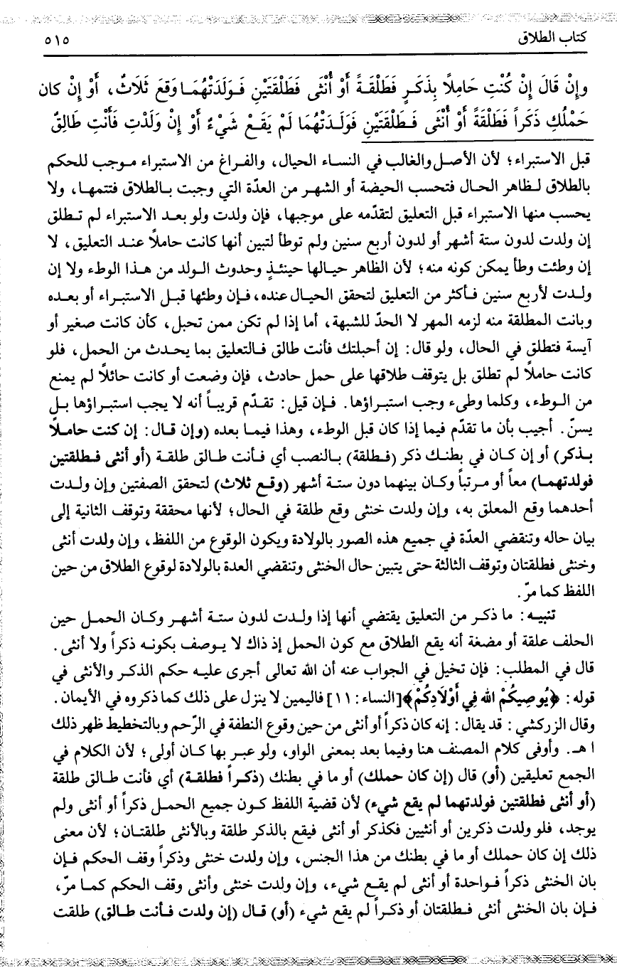 (أَوْ) قَالَ (إنْ كَانَ حَمْلُك) أَوْ مَا فِي بَطْنِك (ذَكَرًا فَطَلْقَةً) أَيْ فَأَنْتِ طَالِقٌ طَلْقَةً (أَوْ أُنْثَى فَطَلْقَتَيْنِ فَوَلَدَتْهُمَا لَمْ يَقَعْ شَيْءٌ) لِأَنَّ قَضِيَّةَ اللَّفْظِ كَوْنُ جَمِيعِ الْحَمْلِ ذَكَرًا أَوْ أُنْثَى وَلَمْ يُوجَدْ، فَلَوْ وَلَدَتْ ذَكَرَيْنِ أَوْ أُنْثَيَيْنِ فَكَذَكَرٍ أَوْ أُنْثَى فَيَقَعُ بِالذَّكَرِ طَلْقَةٌ وَبِالْأُنْثَى طَلْقَتَانِ؛ لِأَنَّ مَعْنَى ذَلِكَ إنْ كَانَ حَمْلُك أَوْ مَا فِي بَطْنِك مِنْ هَذَا الْجِنْسِ، وَإِنْ وَلَدَتْ خُنْثَى وَذَكَرًا وُقِفَ الْحُكْمُ فَإِنْ بَانَ الْخُنْثَى ذَكَرًا فَوَاحِدَةً أَوْ أُنْثَى لَمْ يَقَعْ شَيْءٌ، وَإِنْ وَلَدَتْ خُنْثَى وَأُنْثَى وُقِفَ الْحُكْمُ كَمَا مَرَّ، فَإِنْ بَانَ الْخُنْثَى أُنْثَى فَطَلْقَتَانِ أَوْ ذَكَرًا لَمْ يَقَعْ شَيْءٌ (أَوْ) قَالَ.