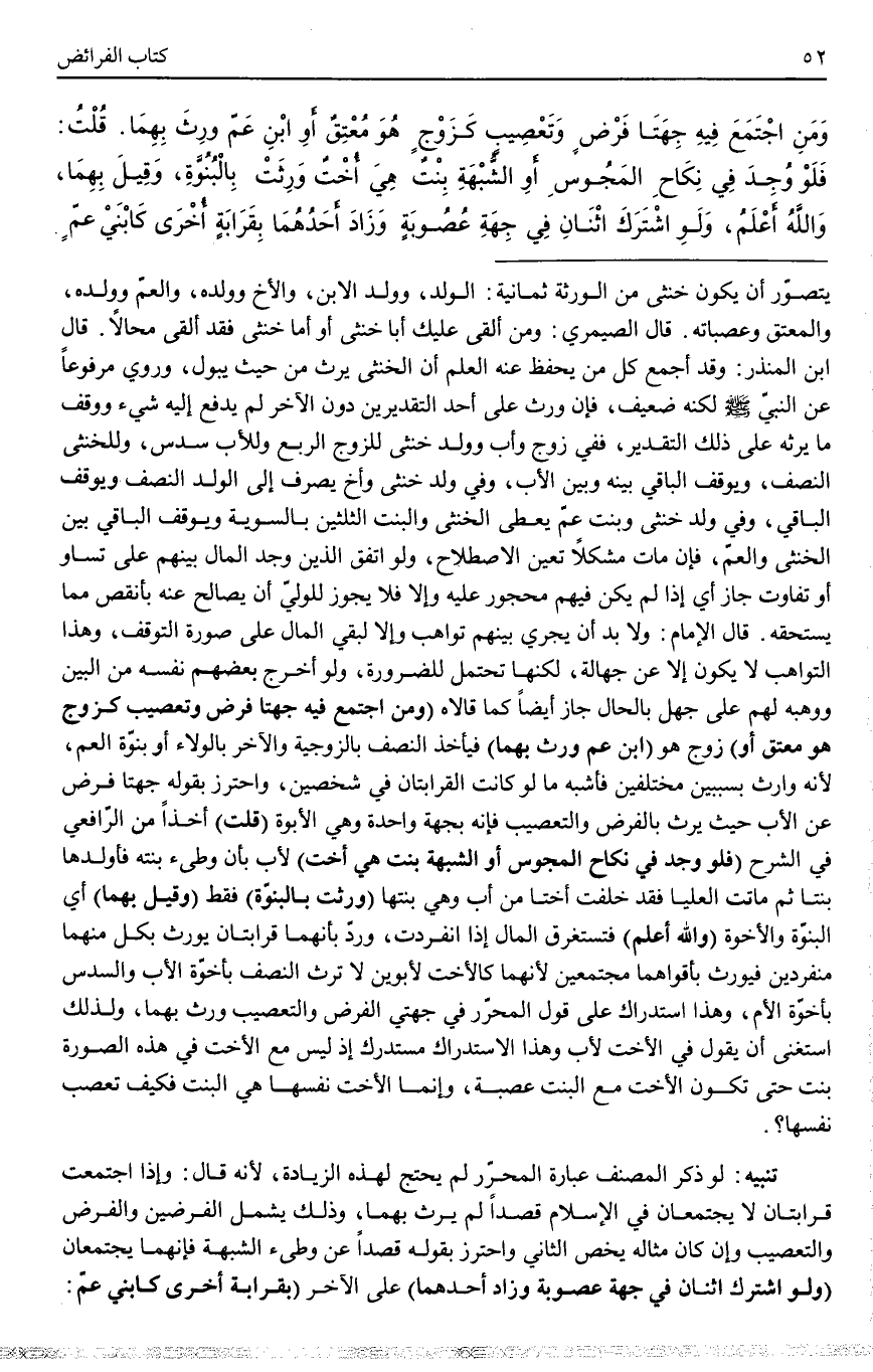 تَنْبِيهٌ: لَوْ ذَكَرَ الْمُصَنِّفُ عِبَارَةَ الْمُحَرَّرِ لَمْ يَحْتَجْ لِهَذِهِ الزِّيَادَةِ، لِأَنَّهُ قَالَ: وَإِذَا اجْتَمَعَتْ قَرَابَتَانِ لَا يَجْتَمِعَانِ فِي الْإِسْلَامِ قَصْدًا لَمْ يَرِثْ بِهِمَا، وَذَلِكَ يَشْمَلُ الْفَرْضَيْنِ، وَالْفَرْضَ وَالتَّعْصِيبَ وَإِنْ كَانَ مِثَالُهُ يَخُصُّ الثَّانِيَ وَاحْتَرَزَ بِقَوْلِهِ قَصْدًا عَنْ وَطْءِ الشُّبْهَةِ فَإِنَّهُمَا يَجْتَمِعَانِ.