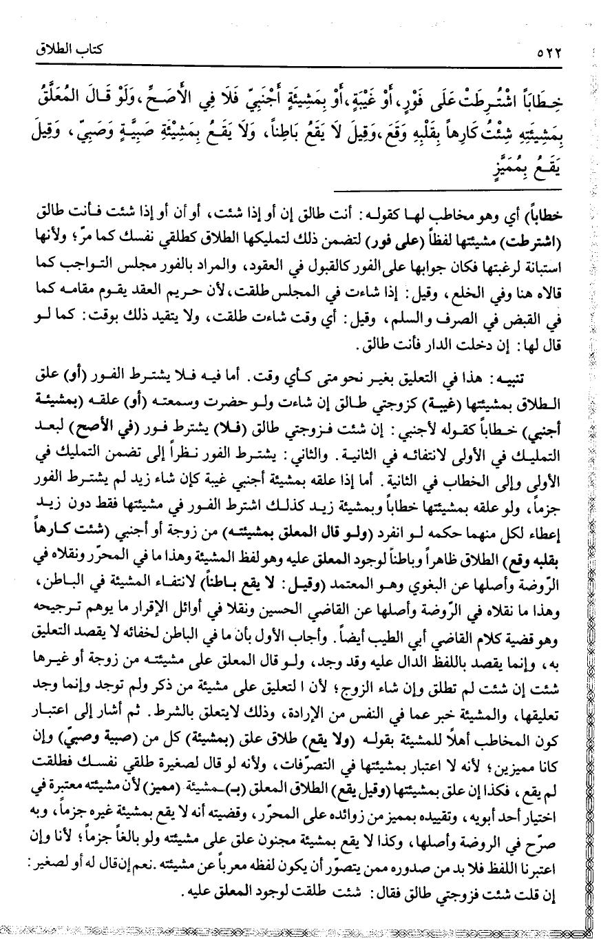 تَنْبِيهٌ: هَذَا فِي التَّعْلِيقِ بِغَيْرِ نَحْوِ مَتَى كَأَيِّ وَقْتٍ. أَمَّا فِيهِ فَلَا يُشْتَرَطُ الْفَوْرُ (أَوْ) عَلَّقَ الطَّلَاقَ بِمَشِيئَتِهَا (غَيْبَةً) كَزَوْجَتِي طَالِقٌ إنْ شَاءَتْ وَلَوْ حَضَرَتْ وَسَمِعَتْهُ (أَوْ) عَلَّقَهُ (بِمَشِيئَةِ أَجْنَبِيٍّ) خِطَابًا كَقَوْلِهِ لِأَجْنَبِيٍّ: إنْ شِئْت فَزَوْجَتِي طَالِقٌ (فَلَا) يُشْتَرَطُ فَوْرٌ (فِي الْأَصَحِّ) لِبُعْدِ التَّمْلِيكِ فِي الْأُولَى لِانْتِفَائِهِ فِي الثَّانِيَةِ. وَالثَّانِي: يُشْتَرَطُ الْفَوْرُ نَظَرًا إلَى تَضَمُّنِ التَّمْلِيكِ فِي الْأُولَى وَإِلَى الْخِطَابِ فِي الثَّانِيَةِ. أَمَّا إذَا عَلَّقَهُ بِمَشِيئَةِ أَجْنَبِيٍّ غَيْبَةً كَإِنْ شَاءَ زَيْدٌ لَمْ يُشْتَرَطْ الْفَوْرُ جَزْمًا، وَلَوْ عَلَّقَهُ بِمَشِيئَتِهَا خِطَابًا وَبِمَشِيئَةِ زَيْدٍ كَذَلِكَ اُشْتُرِطَ الْفَوْرُ فِي مَشِيئَتِهَا فَقَطْ دُونَ زَيْدٍ إعْطَاءً لِكُلٍّ مِنْهُمَا حُكْمَهُ لَوْ انْفَرَدَ (وَلَوْ قَالَ الْمُعَلَّقُ بِمَشِيئَتِهِ) مِنْ زَوْجَةٍ أَوْ أَجْنَبِيٍّ (شِئْت كَارِهًا بِقَلْبِهِ وَقَعَ) الطَّلَاقُ ظَاهِرًا وَبَاطِنًا لِوُجُودِ الْمُعَلَّقِ عَلَيْهِ، وَهُوَ لَفْظُ الْمَشِيئَةِ وَهَذَا مَا فِي الْمُحَرَّرِ وَنَقَلَاهُ فِي الرَّوْضَةِ وَأَصْلِهَا عَنْ الْبَغَوِيِّ وَهُوَ الْمُعْتَمَدُ (وَقِيلَ: لَا يَقَعُ بَاطِنًا) لِانْتِفَاءِ الْمَشِيئَةِ فِي الْبَاطِنِ، وَهَذَا مَا نَقَلَاهُ فِي الرَّوْضَةِ وَأَصْلِهَا عَنْ الْقَاضِي الْحُسَيْنِ وَنَقَلَا فِي أَوَائِلِ الْإِقْرَارِ مَا يُوهِمُ تَرْجِيحَهُ وَهُوَ قَضِيَّةُ كَلَامِ الْقَاضِي أَبِي الطَّيِّبِ أَيْضًا.
