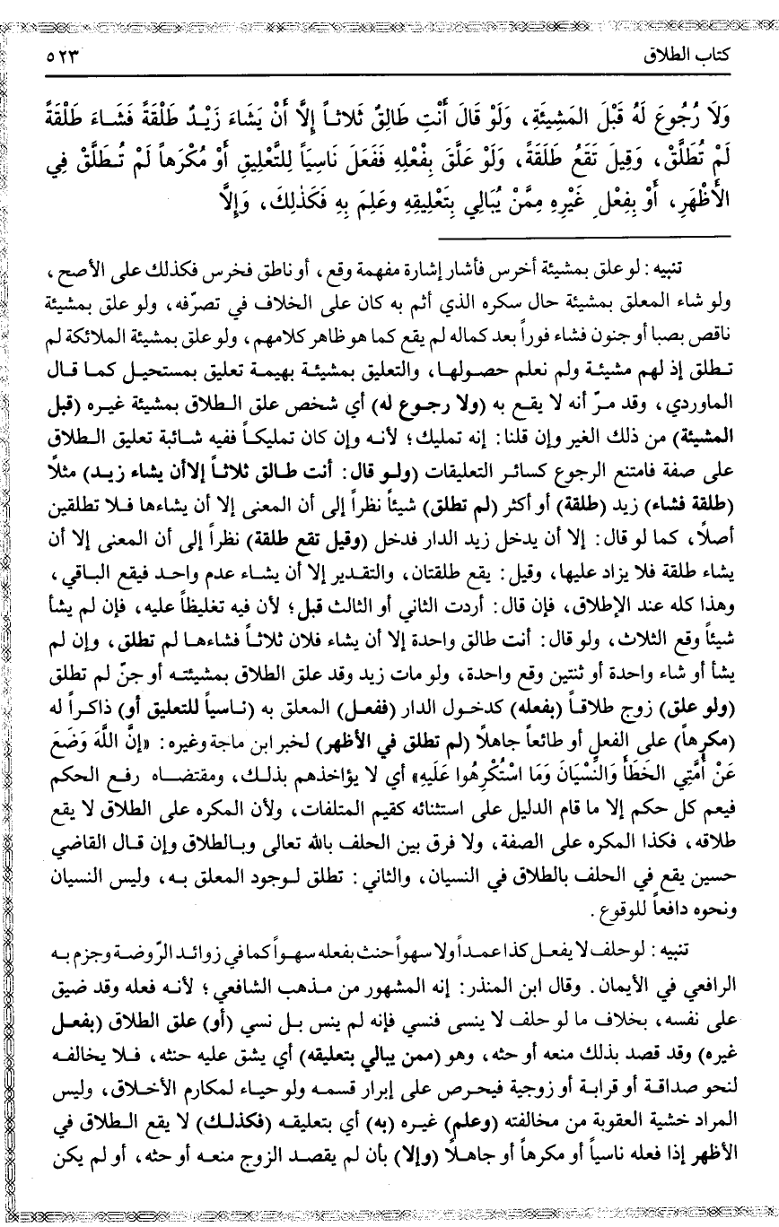 تَنْبِيهٌ: لَوْ حَلَفَ لَا يَفْعَلُ كَذَا عَمْدًا وَلَا سَهْوًا حَنِثَ بِفِعْلِهِ سَهْوًا كَمَا فِي زَوَائِدِ الرَّوْضَةِ وَجَزَمَ بِهِ الرَّافِعِيُّ فِي الْأَيْمَانِ. وَقَالَ ابْنُ الْمُنْذِرِ: إنَّهُ الْمَشْهُورُ مِنْ مَذْهَبِ الشَّافِعِيِّ؛ لِأَنَّهُ فَعَلَهُ وَقَدْ ضَيَّقَ عَلَى نَفْسِهِ، بِخِلَافِ مَا لَوْ حَلَفَ لَا يَنْسَى فَنَسِيَ فَإِنَّهُ لَمْ يَنْسَ بَلْ نُسِّيَ (أَوْ) عَلَّقَ الطَّلَاقَ (بِفِعْلِ غَيْرِهِ) وَقَدْ قَصَدَ بِذَلِكَ مَنْعَهُ أَوْ حَثَّهُ، وَهُوَ (مِمَّنْ يُبَالِي بِتَعْلِيقِهِ) أَيْ يَشُقُّ عَلَيْهِ حِنْثُهُ، فَلَا يُخَالِفُهُ لِنَحْوِ صَدَاقَةٍ أَوْ قَرَابَةٍ أَوْ زَوْجِيَّةٍ فَيَحْرِصُ عَلَى إبْرَارِ قَسَمِهِ وَلَوْ حَيَاءً لِمَكَارِمِ الْأَخْلَاقِ وَلَيْسَ الْمُرَادُ خَشْيَةَ الْعُقُوبَةِ مِنْ مُخَالَفَتِهِ (وَعَلِمَ) غَيْرُهُ (بِهِ) أَيْ بِتَعْلِيقِهِ (فَكَذَلِكَ) لَا يَقَعُ الطَّلَاقُ فِي الْأَظْهَرِ إذَا فَعَلَهُ نَاسِيًا أَوْ مُكْرَهًا أَوْ جَاهِلًا (وَإِلَّا) بِأَنْ لَمْ يَقْصِدْ الزَّوْجُ مَنْعَهُ أَوْ حَثَّهُ، أَوْ لَمْ يَكُنْ