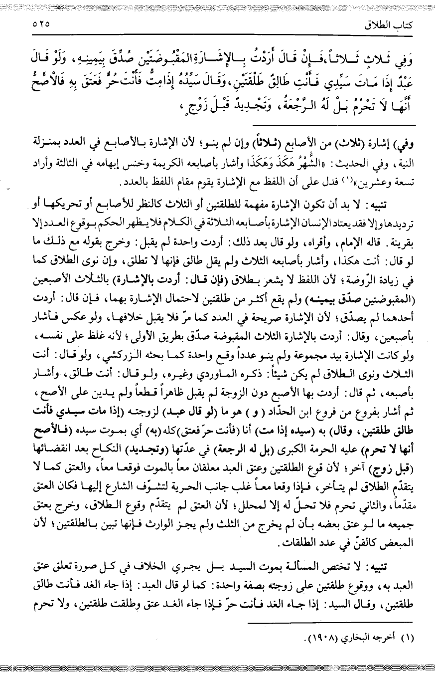 ـــــــــــــــــــــــــــــQوَفِي) إشَارَةِ (ثَلَاثٍ) مِنْ الْأَصَابِعِ (ثَلَاثًا) وَإِنْ لَمْ يَنْوِ؛ لِأَنَّ الْإِشَارَةَ بِالْأَصَابِعِ فِي الْعَدَدِ بِمَنْزِلَةِ النِّيَّةِ، وَفِي الْحَدِيثِ: «الشَّهْرُ هَكَذَا وَهَكَذَا وَأَشَارَ بِأَصَابِعِهِ الْكَرِيمَةِ وَخَنَسَ إبْهَامَهُ فِي الثَّالِثَةِ وَأَرَادَ تِسْعَةً وَعِشْرِينَ» فَدَلَّ عَلَى أَنَّ اللَّفْظَ مَعَ الْإِشَارَةِ يَقُومُ مَقَامَ اللَّفْظِ بِالْعَدَدِ.