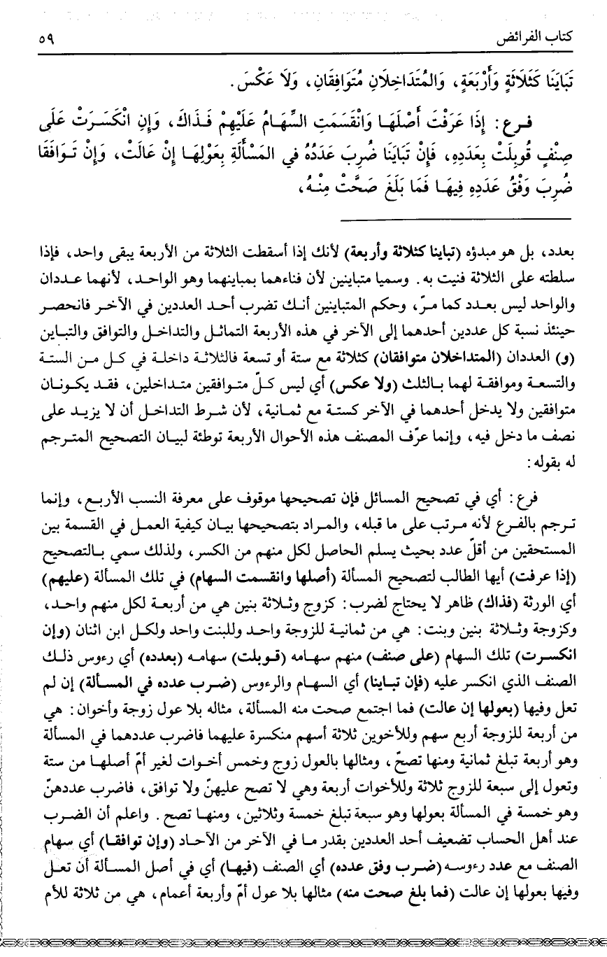 وَاعْلَمْ أَنَّ الضَّرْبَ عِنْدَ أَهْلِ الْحِسَابِ تَضْعِيفُ أَحَدِ الْعَدَدَيْنِ بِقَدْرِ مَا فِي الْآخَرِ مِنْ الْآحَادِ (وَإِنْ تَوَافَقَا) أَيْ سِهَامُ الصِّنْفِ مَعَ عَدَدِ رُءُوسِهِ (ضُرِبَ وَفْقُ عَدَدِهِ) أَيْ الصِّنْفِ (فِيهَا) أَيْ فِي أَصْلِ الْمَسْأَلَةِ إنْ تَعُلْ وَفِيهَا بِعَوْلِهَا إنْ عَالَتْ (فَمَا بَلَغَ صَحَّتْ مِنْهُ) مِثَالُهَا بِلَا عَوْلٍ أُمٌّ وَأَرْبَعَةُ أَعْمَامٍ، هِيَ مِنْ ثَلَاثَةٍ لِلْأُمِّ