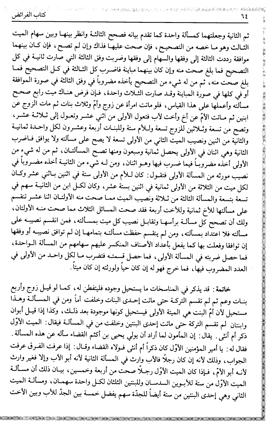 خَاتِمَةٌ: قَدْ يُذْكَرُ فِي الْمُنَاسَخَاتِ مَا يَسْتَحِيلُ وُجُودُهُ فَلْيُتَفَطَّنْ لَهُ، كَمَا لَوْ قِيلَ زَوْجٌ وَأَرْبَعُ بَنَاتٍ وَعَمٌّ ثُمَّ لَمْ تُقَسَّمْ التَّرِكَةُ حَتَّى مَاتَتْ إحْدَى الْبَنَاتِ وَخَلَّفَتْ أُمًّا وَمَنْ فِي الْمَسْأَلَةِ وَهَذَا مُسْتَحِيلٌ لِأَنَّ أُمَّ الْبِنْتِ هِيَ الْمَيِّتَةُ الْأُولَى فَيَسْتَحِيلُ كَوْنُهَا مَوْجُودَةً بَعْدَ ذَلِكَ، وَكَذَا إذَا قِيلَ: أَبَوَانِ وَابْنَتَانِ لَمْ تُقَسَّمْ التَّرِكَةُ حَتَّى مَاتَتْ إحْدَى الْبِنْتَيْنِ وَخَلَّفَتْ مَنْ فِي الْمَسْأَلَةِ فَيُقَالُ: الْمَيِّتُ الْأَوَّلُ ذَكَرٌ أَمْ أُنْثَى. يُقَالُ: إنَّ الْمَأْمُونَ لَمَّا أَرَادَ أَنْ يُوَلِّيَ يَحْيَى بْنَ أَكْثَمَ الْقَضَاءَ سَأَلَهُ عَنْ هَذِهِ الْمَسْأَلَةِ. فَقَالَ لَهُ: يَا أَمِيرَ الْمُؤْمِنِينَ الْأَوَّلُ كَانَ ذَكَرًا أَمْ أُنْثَى فَوَلَّاهُ الْقَضَاءَ وَقَالَ: إذَا عَرَفْتَ الْفَرْقَ عَرَفْتَ الْجَوَابَ، وَذَلِكَ لِأَنَّهُ إنْ كَانَ رَجُلًا فَالْأَبُ وَارِثٌ فِي الْمَسْأَلَةِ الثَّانِيَةِ لِأَنَّهُ أَبُو الْأَبِ وَإِلَّا فَغَيْرُ وَارِثٍ لِأَنَّهُ أَبُو الْأُمِّ، فَإِذَا كَانَ الْمَيِّتُ الْأَوَّلُ رَجُلًا صَحَّتْ مِنْ أَرْبَعَةٍ وَخَمْسِينَ، بَيَانُ ذَلِكَ أَنَّ مَسْأَلَةَ الْمَيِّتِ الْأَوَّلِ مِنْ سِتَّةٍ لِلْأَبَوَيْنِ السُّدُسَانِ وَلِلْبِنْتَيْنِ الثُّلُثَانِ لِكُلِّ وَاحِدَةٍ سَهْمَانِ، وَمَسْأَلَةُ الْمَيِّتِ الثَّانِي وَهِيَ إحْدَى الْبِنْتَيْنِ مِنْ سِتَّةٍ أَيْضًا لِلْجَدَّةِ سَهْمٌ يَفْضُلُ خَمْسَةٌ بَيْنَ الْجَدِّ لِلْأَبِ وَبَيْنَ الْأُخْتِ