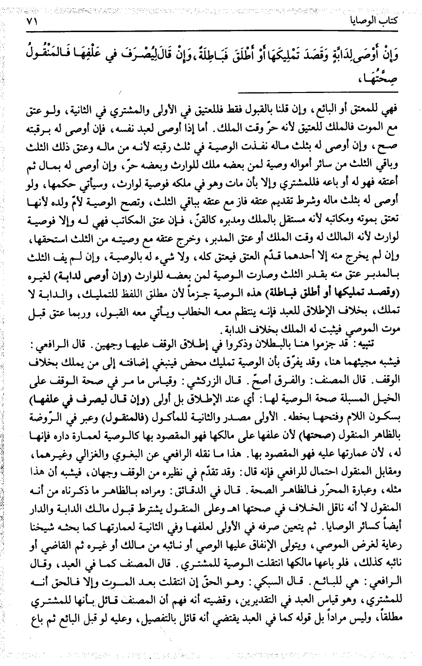 وَعَلَى الْمَنْقُولِ يُشْتَرَطُ قَبُولُ مَالِكِ الدَّابَّةِ وَالدَّارِ أَيْضًا كَسَائِرِ الْوَصَايَا. ثُمَّ يَتَعَيَّنُ صَرْفُهُ فِي الْأُولَى لِعَلْفِهَا، وَفِي الثَّانِيَةِ لِعِمَارَتِهَا كَمَا بَحَثَهُ شَيْخُنَا رِعَايَةً لِغَرَضِ الْمُوصِي، وَيَتَوَلَّى الْإِنْفَاقَ عَلَيْهَا الْوَصِيُّ أَوْ نَائِبُهُ مِنْ مَالِكٍ أَوْ غَيْرِهِ ثُمَّ الْقَاضِي أَوْ نَائِبُهُ كَذَلِكَ، فَلَوْ بَاعَهَا مَالِكُهَا انْتَقَلَتْ الْوَصِيَّةُ لِلْمُشْتَرِي. قَالَ الْمُصَنِّفُ كَمَا فِي الْعَبْدِ، وَقَالَ الرَّافِعِيُّ: هِيَ لِلْبَائِعِ. قَالَ السُّبْكِيُّ: وَهُوَ الْحَقُّ إنْ انْتَقَلَتْ بَعْدَ الْمَوْتِ وَإِلَّا فَالْحَقُّ أَنَّهُ لِلْمُشْتَرِي، وَهُوَ قِيَاسُ الْعَبْدِ فِي التَّقْدِيرَيْنِ، وَقَضِيَّتُهُ أَنَّهُ فُهِمَ أَنَّ الْمُصَنِّفَ قَائِلٌ بِأَنَّهَا لِلْمُشْتَرِي مُطْلَقًا، وَلَيْسَ مُرَادًا بَلْ قَوْلُهُ كَمَا فِي الْعَبْدِ يَقْتَضِي أَنَّهُ قَائِلٌ بِالتَّفْصِيلِ، وَعَلَيْهِ لَوْ قَبِلَ الْبَائِعُ ثُمَّ بَاعَ