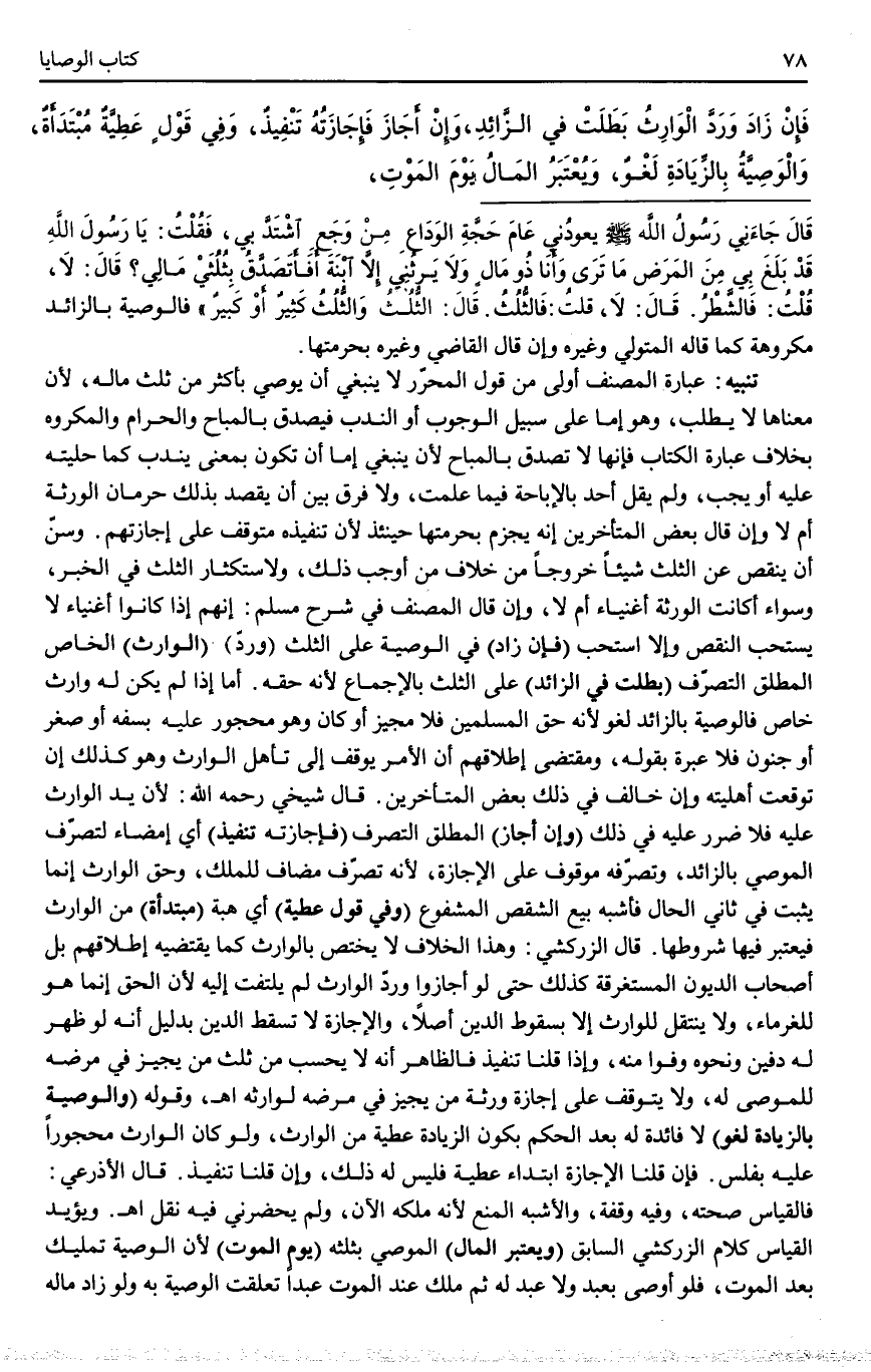 ـــــــــــــــــــــــــــــQ «أَنَّ سَعْدَ بْنَ أَبِي وَقَّاصٍ قَالَ جَاءَنِي رَسُولُ اللَّهِ - صَلَّى اللَّهُ عَلَيْهِ وَسَلَّمَ - يَعُودُنِي عَامَ حَجَّةِ الْوَدَاعِ مِنْ وَجَعٍ اشْتَدَّ بِي، فَقُلْتُ: يَا رَسُولَ اللَّهِ قَدْ بَلَغَ بِي مِنْ الْمَرَضِ مَا تَرَى وَأَنَا ذُو مَالٍ. وَلَا يَرِثُنِي إلَّا ابْنَةٌ أَفَأَتَصَدَّقُ بِثُلُثَيْ مَالِي؟ قَالَ: لَا، قُلْتُ: فَالشَّطْرُ. قَالَ: لَا، قُلْتُ: فَالثُّلُثُ قَالَ: الثُّلُثُ وَالثُّلُثُ كَثِيرٌ أَوْ كَبِيرٌ» فَالْوَصِيَّةُ بِالزَّائِدِ مَكْرُوهَةٌ كَمَا قَالَهُ الْمُتَوَلِّي وَغَيْرُهُ وَإِنْ قَالَ الْقَاضِي وَغَيْرُهُ بِحُرْمَتِهَا.