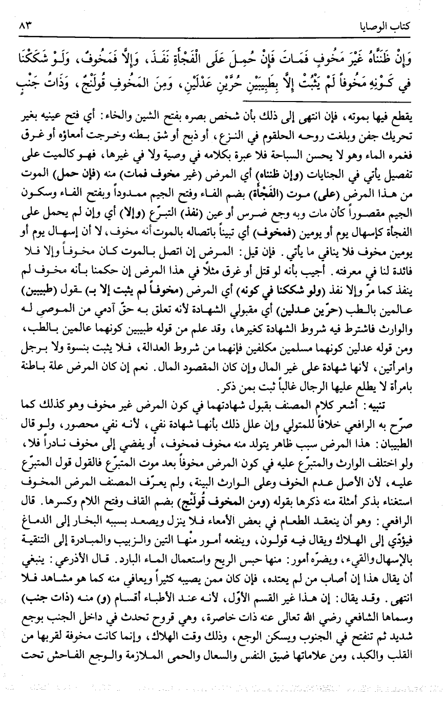 أُجِيبَ بِأَنَّهُ لَوْ قُتِلَ أَوْ غَرِقَ مَثَلًا فِي هَذَا الْمَرَضِ إنْ حَكَمْنَا بِأَنَّهُ مَخُوفٌ لَمْ يَنْفُذْ كَمَا مَرَّ وَإِلَّا نَفَذَ (وَلَوْ شَكَكْنَا فِي كَوْنِهِ) أَيْ الْمَرَضِ (مَخُوفًا لَمْ يَثْبُتْ إلَّا بِ) قَوْلِ (طَبِيبَيْنِ) عَالِمَيْنِ بِالطِّبِّ (حُرَّيْنِ عَدْلَيْنِ) أَيْ مَقْبُولَيْ الشَّهَادَةِ لِأَنَّهُ تَعَلَّقَ بِهِ حَقُّ آدَمِيٍّ مِنْ الْمُوصَى لَهُ وَالْوَارِثِ فَاشْتُرِطَ فِيهِ شَرْطُ الشَّهَادَةِ كَغَيْرِهَا، وَقَدْ عُلِمَ مِنْ قَوْلِهِ طَبِيبَيْنِ كَوْنُهُمَا عَالِمَيْنِ بِالطِّبِّ، وَمِنْ قَوْلِهِ عَدْلَيْنِ كَوْنُهُمَا مُسْلِمَيْنِ مُكَلَّفَيْنِ فَإِنَّهُمَا مِنْ شُرُوطِ الْعَدَالَةِ، فَلَا يَثْبُتُ بِنِسْوَةٍ وَلَا بِرَجُلٍ وَامْرَأَتَيْنِ؛ لِأَنَّهَا شَهَادَةٌ عَلَى غَيْرِ الْمَالِ وَإِنْ كَانَ الْمَقْصُودُ الْمَالَ. نَعَمْ إنْ كَانَ الْمَرَضُ عِلَّةً بَاطِنَةً بِامْرَأَةٍ لَا يَطَّلِعُ عَلَيْهَا الرِّجَالُ غَالِبًا ثَبَتَ بِمَنْ ذُكِرَ.