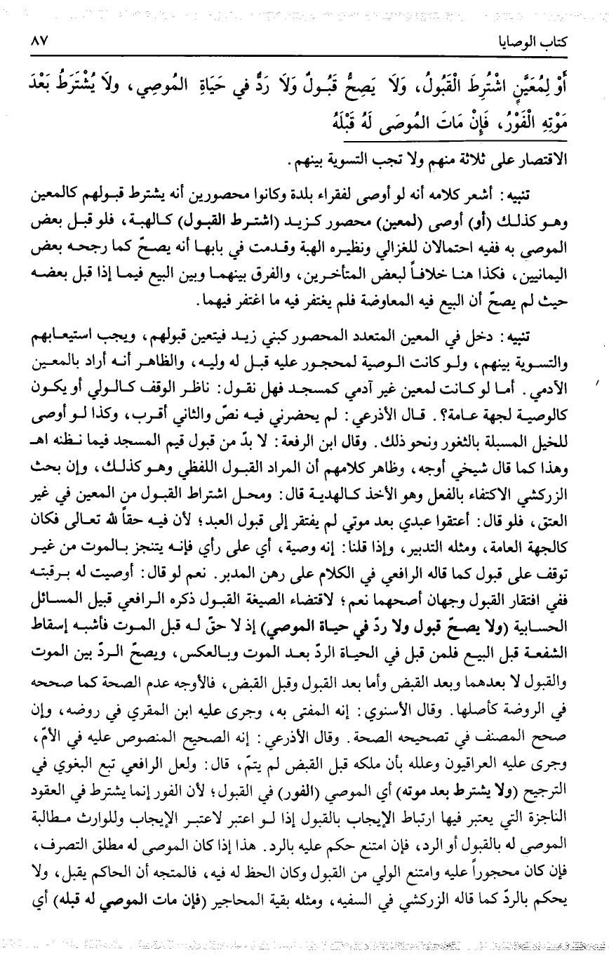 تَنْبِيهٌ: أَشْعَرَ كَلَامُهُ أَنَّهُ لَوْ أَوْصَى لِفُقَرَاءِ بَلْدَةٍ وَكَانُوا مَحْصُورِينَ أَنَّهُ يُشْتَرَطُ قَبُولُهُمْ كَالْمُعَيَّنِ وَهُوَ كَذَلِكَ (أَوْ) أَوْصَى (لِمُعَيَّنٍ) مَحْصُورٍ كَزَيْدٍ (اُشْتُرِطَ الْقَبُولُ) كَالْهِبَةِ، فَلَوْ قَبِلَ بَعْضَ الْمُوصَى بِهِ فَفِيهِ احْتِمَالَانِ لِلْغَزَالِيِّ وَنَظِيرُهُ الْهِبَةُ وَقَدَّمْتُ فِي بَابِهَا أَنَّهُ يَصِحُّ كَمَا رَجَّحَهُ بَعْضُ الْيَمَانِيِّينَ فَكَذَا هُنَا خِلَافًا لِبَعْضِ الْمُتَأَخِّرِينَ، وَالْفَرْقُ بَيْنَهُمَا وَبَيْنَ الْبَيْعِ فِيمَا إذَا قَبِلَ بَعْضَهُ حَيْثُ لَمْ يَصِحَّ أَنَّ الْبَيْعَ فِيهِ الْمُعَاوَضَةُ فَلَمْ يُغْتَفَرْ فِيهِ مَا اُغْتُفِرَ فِيهِمَا.