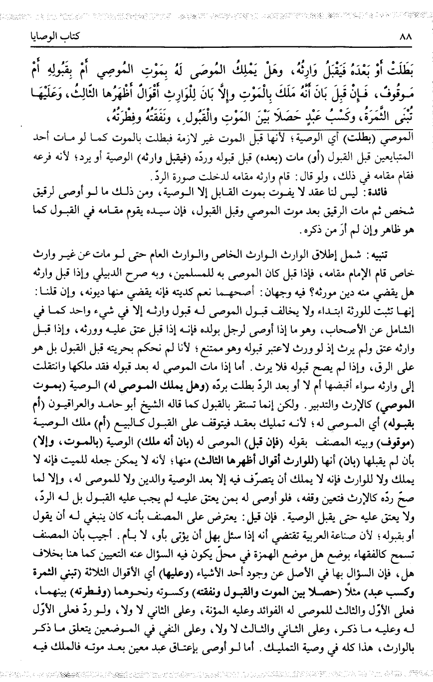أُجِيبَ بِأَنَّ الْمُصَنِّفَ تَسَمَّحَ كَالْفُقَهَاءِ بِوَضْعِ هَلْ مَوْضِعَ الْهَمْزَةِ فِي مَحَلٍّ يَكُونُ فِيهِ السُّؤَالُ عَنْ التَّعْيِينِ كَمَا هُنَا بِخِلَافِ هَلْ، فَإِنَّ السُّؤَالَ بِهَا فِي الْأَصْلِ عَنْ وُجُودِ أَحَدِ الْأَشْيَاءِ (وَعَلَيْهَا) أَيْ: الْأَقْوَالِ الثَّلَاثَةِ (تُبْنَى الثَّمَرَةُ وَكَسْبُ عَبْدٍ) مَثَلًا (حَصَلَا بَيْنَ الْمَوْتِ وَالْقَبُولِ وَنَفَقَتُهُ) وَكِسْوَتُهُ وَنَحْوهُمَا (وَفِطْرَتُهُ) بَيْنَهُمَا، فَعَلَى الْأَوَّلِ وَالثَّالِثُ لِلْمُوصَى لَهُ الْفَوَائِدُ وَعَلَيْهِ الْمُؤْنَةُ، وَعَلَى الثَّانِي لَا وَلَا، وَلَوْ رَدَّ فَعَلَى الْأَوَّلِ لَهُ وَعَلَيْهِ مَا ذُكِرَ، وَعَلَى الثَّانِي وَالثَّالِثِ لَا وَلَا، وَعَلَى النَّفْيِ فِي الْمَوْضِعَيْنِ يَتَعَلَّقُ مَا ذُكِرَ بِالْوَارِثِ، هَذَا كُلُّهُ فِي وَصِيَّةِ التَّمْلِيكِ.
