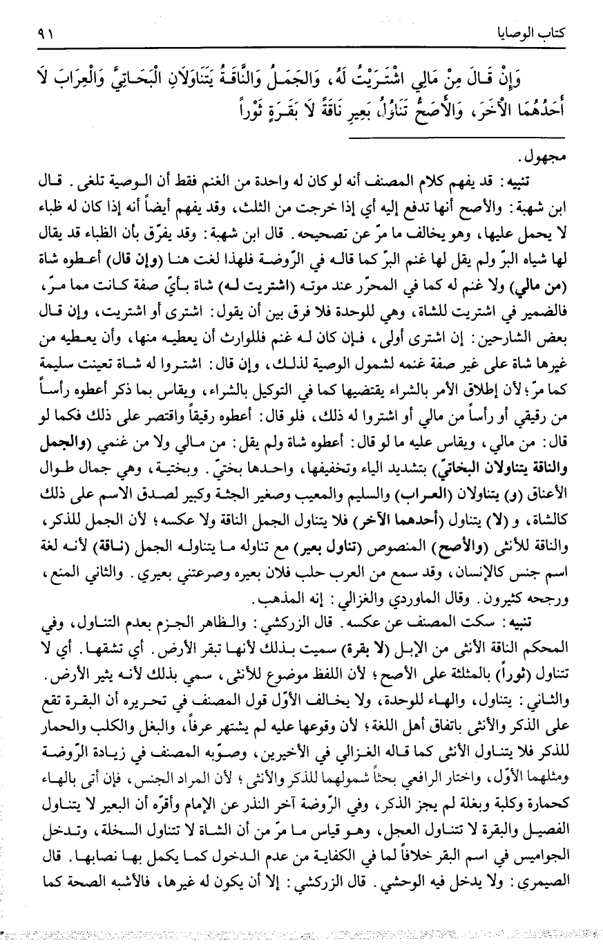 تَنْبِيهٌ: قَدْ يُفْهِمُ كَلَامُ الْمُصَنِّفِ أَنَّهُ لَوْ كَانَ لَهُ وَاحِدَةٌ مِنْ الْغَنَمِ فَقَطْ أَنَّ الْوَصِيَّةَ تُلْغَى. قَالَ ابْنُ شُهْبَةَ: وَالْأَصَحُّ أَنَّهَا تُدْفَعُ إلَيْهِ أَيْ: إذَا خَرَجَتْ مِنْ الثُّلُثِ، وَقَدْ يُفْهَمُ أَيْضًا أَنَّهُ إذَا كَانَ لَهُ ظِبَاءٌ لَا يُحْمَلُ عَلَيْهَا وَهُوَ يُخَالِفُ مَا مَرَّ عَنْ تَصْحِيحِهِ. قَالَ ابْنُ شُهْبَةَ: وَقَدْ يُفَرَّقُ بِأَنَّ الظِّبَاءَ قَدْ يُقَالُ لَهَا شِيَاهُ الْبَرِّ وَلَمْ يَقُلْ لَهَا غَنَمُ الْبَرِّ كَمَا قَالَهُ فِي الرَّوْضَةِ فَلِهَذَا لَغَتْ هُنَا (وَإِنْ قَالَ) أَعْطُوهُ شَاةً (مِنْ مَالِي) وَلَا غَنَمَ لَهُ كَمَا فِي الْمُحَرَّرِ عِنْدَ مَوْتِهِ (اُشْتُرِيَتْ لَهُ) شَاةٌ بِأَيِّ صِفَةٍ كَانَتْ مِمَّا مَرَّ، فَالضَّمِيرُ فِي اُشْتُرِيَتْ لِلشَّاةِ، وَهِيَ لِلْوَحْدَةِ فَلَا فَرْقَ بَيْنَ أَنْ يَقُولَ: اُشْتُرِيَ أَوْ اُشْتُرِيَتْ، وَإِنْ قَالَ بَعْضُ الشَّارِحِينَ: إنَّ اُشْتُرِيَ أَوْلَى، فَإِنْ كَانَ لَهُ غَنَمٌ فَلِلْوَارِثِ أَنْ يُعْطِيَهُ مِنْهَا، وَأَنْ يُعْطِيَهُ مِنْ غَيْرِهَا شَاةً عَلَى غَيْرِ صِفَةِ غَنَمِهِ لِشُمُولِ الْوَصِيَّةِ لِذَلِكَ وَإِنْ قَالَ: اشْتَرُوا لَهُ شَاةً تَعَيَّنَتْ سَلِيمَةً كَمَا مَرَّ؛ لِأَنَّ إطْلَاقَ الْأَمْرِ بِالشِّرَاءِ يَقْتَضِيهَا كَمَا فِي التَّوْكِيلِ بِالشِّرَاءِ، وَيُقَاسُ بِمَا ذُكِرَ أَعْطُوهُ رَأْسًا مِنْ رَقِيقِي أَوْ رَأْسًا مِنْ مَالِي أَوْ اشْتَرُوا لَهُ ذَلِكَ، فَلَوْ قَالَ: أَعْطُوهُ رَقِيقًا وَاقْتَصَرَ عَلَى ذَلِكَ فَكَمَا لَوْ قَالَ: مِنْ مَالِي، وَيُقَاسُ عَلَيْهِ مَا لَوْ قَالَ: أَعْطُوهُ شَاةً وَلَمْ يَقُلْ: مِنْ مَالِي وَلَا مِنْ غَنَمِي (وَالْجَمَلُ وَالنَّاقَةُ يَتَنَاوَلَانِ الْبَخَاتِيَّ) بِتَشْدِيدِ الْيَاءِ وَتَخْفِيفِهَا، وَاحِدُهَا بُخْتِيٌّ. وَبُخْتِيَّةٌ، وَهِيَ جِمَالٌ طُوَالُ الْأَعْنَاقِ (وَ) يَتَنَاوَلَانِ (الْعِرَابَ) وَالسَّلِيمَ وَالْمَعِيبَ وَصَغِيرَ الْجُثَّةِ وَكَبِيرَهَا لِصِدْقِ الِاسْمِ عَلَى ذَلِكَ كَالشَّاةِ، وَ (لَا) يَتَنَاوَلُ (أَحَدُهُمَا الْآخَرَ) فَلَا يَتَنَاوَلُ الْجَمَلُ النَّاقَةَ وَلَا عَكْسَهُ؛ لِأَنَّ الْجَمَلَ لِلذَّكَرِ، وَالنَّاقَةُ لِلْأُنْثَى (وَالْأَصَحُّ) الْمَنْصُوصُ (تَنَاوُلُ بَعِيرٍ) مَعَ تَنَاوُلِهِ مَا يَتَنَاوَلَهُ الْجَمَلُ (نَاقَةً) لِأَنَّهُ لُغَةً اسْمُ جِنْسٍ كَالْإِنْسَانِ، وَقَدْ سُمِعَ مِنْ الْعَرَبِ حَلَبَ فُلَانٌ بَعِيرَهُ وَصَرَعَتْنِي بَعِيرِي. وَالثَّانِي الْمَنْعُ، وَرَجَّحَهُ كَثِيرُونَ.