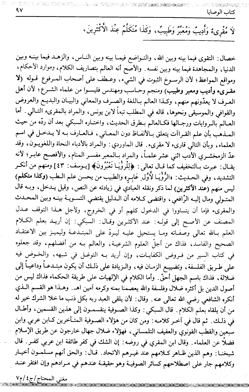 وَالْأَصَحُّ أَنَّهُ الْعَالِمُ بِتَصَارِيفِ الْكَلَامِ، وَمَوَارِدِ الْأَحْكَامِ، وَمَوَاقِعِ الْمَوَاعِظِ؛ لِأَنَّ الرُّسُوخَ الثُّبُوتُ فِي الشَّيْءِ، وَعَطَفَ عَلَى أَصْحَابِ الْمَرْفُوعِ قَوْلَهُ (لَا مُقْرِئٌ وَأَدِيبٌ وَمُعَبِّرٌ وَطَبِيبٌ) وَمُنَجِّمٌ وَحَاسِبٌ وَمُهَنْدِسٌ فَلَيْسُوا مِنْ عُلَمَاءِ الشَّرْعِ؛ لِأَنَّ أَهْلَ الْعُرْفِ لَا يَعُدُّونَهُمْ مِنْهُمْ، وَكَذَا الْعَالِمُ بِاللُّغَةِ وَالصَّرْفِ وَالْمَعَانِي وَالْبَيَانِ وَالْبَدِيعِ وَالْعَرُوضِ وَالْقَوَافِي وَالْمُوسِيقَى وَنَحْوِهَا، قَالَهُ فِي الْمَطْلَبِ تَبَعًا لِابْنِ يُونُسَ، وَالْمُرَادُ بِالْمُقْرِئِ التَّالِي.