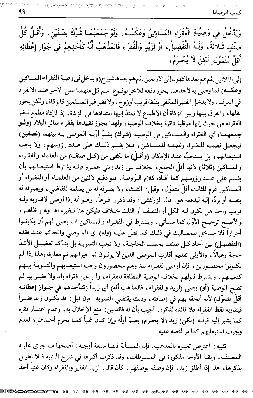(وَيَدْخُلُ فِي وَصِيَّةِ الْفُقَرَاءِ الْمَسَاكِينُ وَعَكْسُهُ) فَمَا وَصَّى بِهِ لِأَحَدِهِمَا يَجُوزُ دَفْعُهُ لِلْآخَرِ لِوُقُوعِ اسْمِ كُلٍّ مِنْهُمَا عَلَى الْآخَرِ عِنْدَ الِانْفِرَادِ فِي الْعُرْفِ وَلَا يَدْخُلُ الْفَقِيرُ الْمَكْفِيُّ بِنَفَقَةِ قَرِيبٍ أَوْ زَوْجٍ، وَلَا فَقِيرُ غَيْرِ الْمُسْلِمِينَ كَالزَّكَاةِ، وَلَكِنْ يَجُوزُ نَقْلُهَا، وَالْفَرْقُ بَيْنَهَا وَبَيْنَ الزَّكَاةِ أَنَّ الْأَطْمَاعَ لَا تَمْتَدُّ إلَيْهَا امْتِدَادَهَا فِي الزَّكَاةِ، إذْ الزَّكَاةُ مَطْمَعُ نَظَرِ الْفُقَرَاءِ مِنْ حَيْثُ إنَّهَا مُوَظَّبَةٌ دَائِرَةٌ بِخِلَافِ الْوَصِيَّةِ، وَلِهَذَا يَجُوزُ تَقْيِيدُهَا بِفُقَرَاءِ سَائِرِ الْبِلَادِ (وَلَوْ جَمَعَهُمَا) أَيْ الْفُقَرَاءَ وَالْمَسَاكِينَ فِي الْوَصِيَّةِ (شُرِّكَ) بِضَمِّ أَوَّلِهِ الْمُوصَى بِهِ بَيْنَهُمَا (نِصْفَيْنِ) فَيُجْعَلُ نِصْفُهُ لِلْفُقَرَاءِ وَنِصْفُهُ لِلْمَسَاكِينِ، فَلَا يُقْسَمُ ذَلِكَ عَلَى عَدَدِ رُءُوسِهِمْ، وَلَا يَجِبُ اسْتِيعَابُهُمْ، بَلْ يُسْتَحَبُّ عِنْدَ الْإِمْكَانِ (وَأَقَلُّ) مَا يَكْفِي مِنْ (كُلِّ صِنْفٍ) مِنْ الْعُلَمَاءِ وَالْفُقَرَاءِ وَالْمَسَاكِينِ (ثَلَاثَةٌ) لِأَنَّهَا أَقَلُّ الْجَمْعِ، بِخِلَافِ بَنِي زَيْدٍ وَبَنِي عَمْرٍو فَإِنَّهُ يُشْتَرَطُ اسْتِيعَابُهُمْ بِأَنْ يُقْسَمَ عَلَى عَدَدِ رُءُوسِهِمْ كَمَا أَفَادَهُ كَلَامُ الرَّوْضَةِ، فَلَوْ دَفَعَ لِاثْنَيْنِ مِنْ الْعُلَمَاءِ أَوْ الْفُقَرَاءِ أَوْ الْمَسَاكِينِ غَرِمَ لِلثَّالِثِ أَقَلَّ مُتَمَوَّلٍ، وَقِيلَ: الثُّلُثُ، وَلَا يَصْرِفُهُ لَهُ بَلْ يُسَلِّمُهُ لِلْقَاضِي، وَيَصْرِفُهُ لَهُ بِنَفْسِهِ أَوْ يَرُدُّهُ إلَيْهِ لِيَدْفَعَهُ هُوَ.