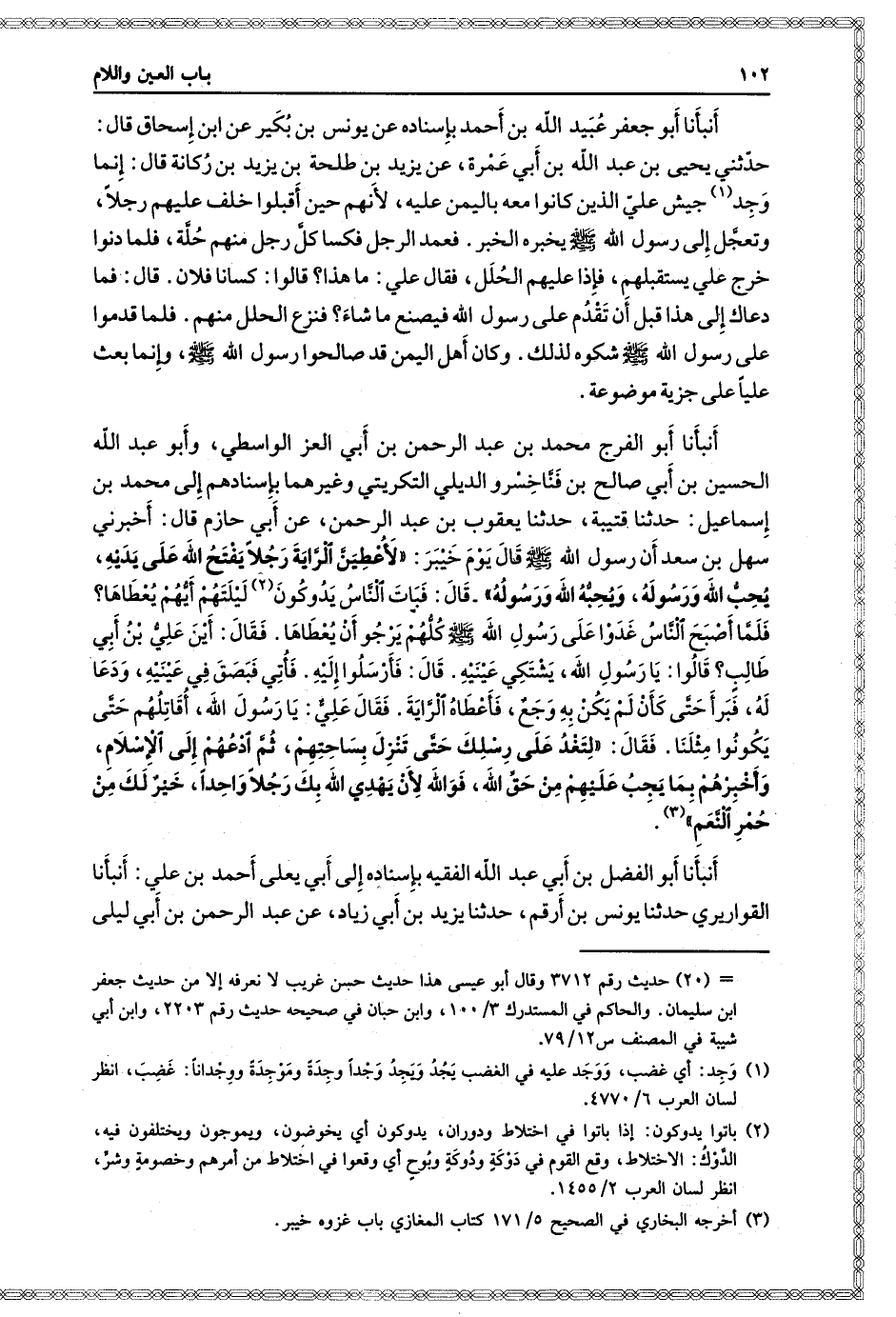 (١١٢٩) أَنْبَأَنَا أَبُو الْفَرَجِ مُحَمَّدُ بْنُ عَبْدِ الرَّحْمَنِ بْنِ أَبِي الْعِزِّ الْوَاسِطِيُّ وَأَبُو عَبْدِ اللَّهِ الْحُسَيْنُ بْنُ أَبِي صَالِحِ بْنِ فَنَّاخِسْرُو الدِّيلِيُّ التِّكْرِيتِيُّ، وَغَيْرُهُمَا، بِإِسْنَادِهِمْ إِلَى مُحَمَّدِ بْنِ إِسْمَاعِيلَ، حَدَّثَنَا قُتَيْبَةُ، حَدَّثَنَا يَعْقُوبُ بْنُ عَبْدِ الرَّحْمَنِ، عَنْ أَبِي حَازِمٍ، قَالَ: أَخْبَرَنِي سَهْلُ بْنُ سَعْدٍ، أَنَّ رَسُولَ اللَّهِ صَلَّى اللَّهُ عَلَيْهِ وَسَلَّمَ قَالَ يَوْم خَيْبَرَ: " لأُعْطِيَنَّ الرَّايَةَ رَجُلا يَفْتَحُ اللَّهُ عَلَى يَدَيْهِ، يُحِبُّ اللَّهَ وَرَسُولَهُ، وَيُحِبُّهُ اللَّهُ وَرَسُولُهُ "، قَالَ: فَبَاتَ النَّاسُ يَدُوكُونَ لَيْلَتَهُمْ أَيُّهُمْ يُعْطَاهَا؟ فَلَمَّا أَصْبَحَ النَّاسُ غَدَوْا عَلَى رَسُولِ اللَّهِ صَلَّى اللَّهُ عَلَيْهِ وَسَلَّمَ كُلُّهُمْ يَرْجُو أَنْ يُعْطَاهَا، فَقَالَ: " أَيْنَ عَلِيُّ بْنُ أَبِي طَالِبٍ "؟ قَالُوا: يَا رَسُولَ اللَّهِ، يَشْتَكِي عَيْنَيْهِ، قَالَ: " فَأَرْسِلُوا إِلَيْهِ "، فَأُتِيَ فَبَصَقَ فِي عَيْنَيْهِ، وَدَعَا لَهُ فَبَرَأَ حَتَّى كَأَنْ لَمْ يَكُنْ بِهِ وَجَعٌ، فَأَعْطَاهُ الرَّايَةَ، فَقَالَ عَلِيٌّ: يَا رَسُولَ اللَّهِ، أُقَاتِلُهُمْ حَتَّى يَكُونُوا مِثْلَنَا، فَقَالَ: " لِتَغْدُ عَلَى رِسْلِكَ حَتَّى تَنْزِلَ بِسَاحَتِهِمْ، ثُمَّ ادْعُهُمْ إِلَى الإِسْلامِ، وَأَخْبِرْهُمْ بِمَا يَجِبُ عَلَيْهِمْ مِنْ حَقِّ اللَّهِ، فَوَاللَّهِ لأَنْ يَهْدِيَ اللَّهُ بِكَ رَجُلا وَاحِدًا، خَيْرٌ لَكَ مِنْ حُمُرِ النَّعَمِ "