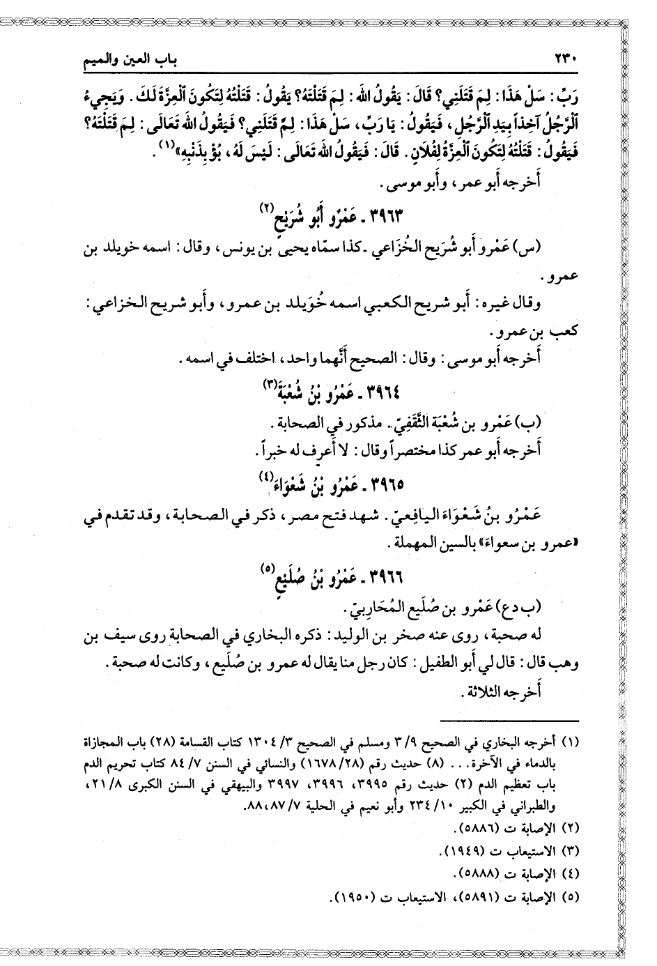 ب: عَمْرو بْن شُعْبَة الثقفي مذكور فِي الصحابة أَخْرَجَهُ أَبُو عُمَر كذا مختصرًا، وقَالَ: لا أعرف لَهُ خبرًا.