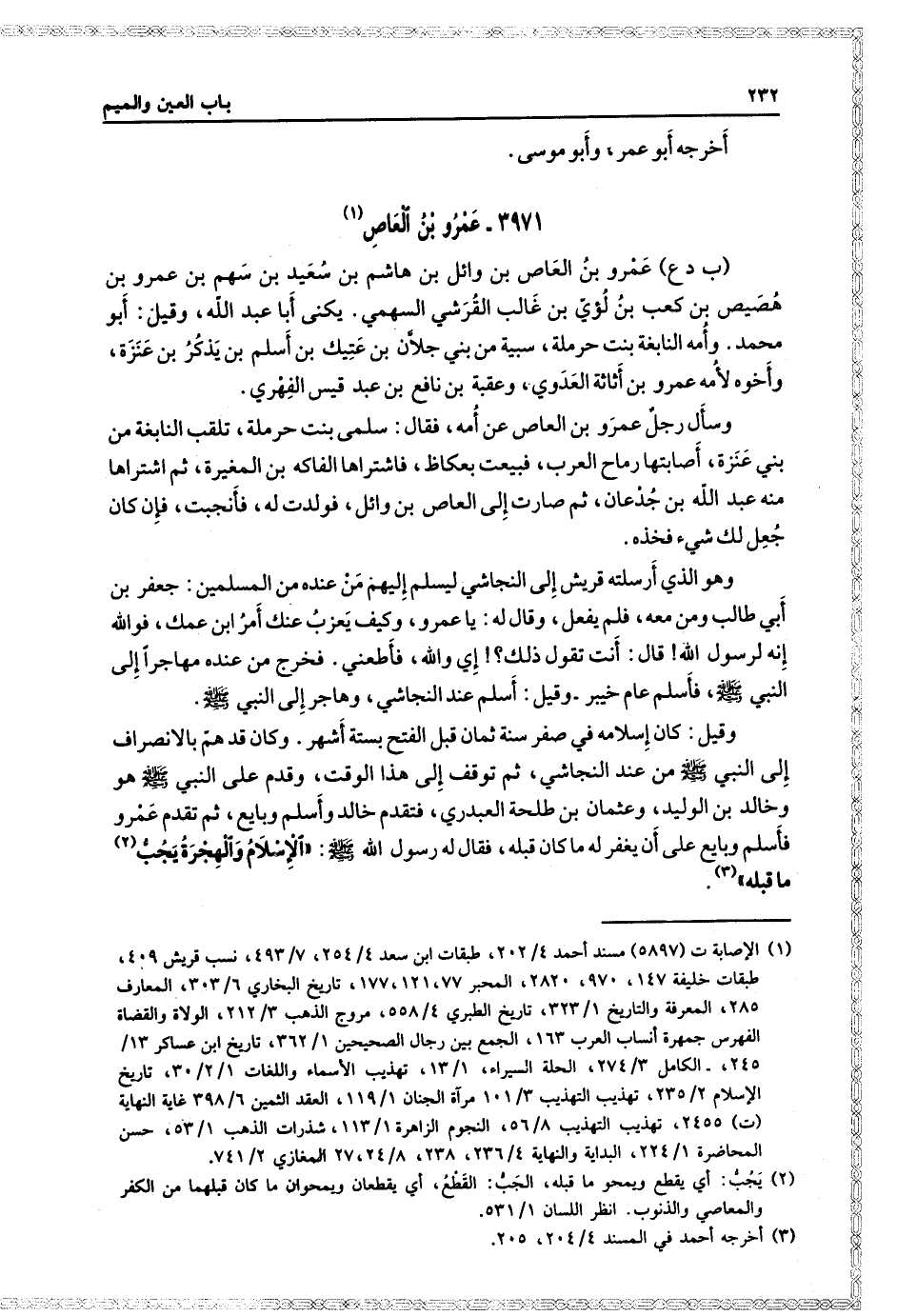 وهو الَّذِي أرسلته قريش إِلَى النجاشي ليسلم إليهم من عنده من المسلمين: جَعْفَر بْن أَبِي طَالِب ومن معه، فلم يفعل، وقَالَ لَهُ: يا عَمْرو، وكيف يعزب عنك أمر ابْن عمك، فوالله إنه لرسول اللَّه حقًا! قَالَ: أنت تَقُولُ ذَلِكَ؟ ! قَالَ: إي والله، فأطعني، فخرج من عنده مهاجرًا إِلَى النَّبِيّ صَلَّى اللَّهُ عَلَيْهِ وَسَلَّمَ فأسلم عام خيبر، وقيل: أسلم عند النجاشي، وهاجر إِلَى النَّبِيّ صَلَّى اللَّهُ عَلَيْهِ وَسَلَّمَ وقيل: كَانَ إسلامه فِي صفر سنة ثمان قبل الفتح بستة أشهر، وكان قَدْ هُمْ بالانصراف إِلَى النَّبِيّ صَلَّى اللَّهُ عَلَيْهِ وَسَلَّمَ من عند النجاشي، ثُمَّ توقف إِلَى هَذَا الوقت، وقدم عَلَى النَّبِيّ صَلَّى اللَّهُ عَلَيْهِ وَسَلَّمَ هُوَ وخالد بْن الْوَلِيد، وعثمان بْن طلحة العبدري، فتقدم خَالِد، وأسلم وبايع، ثُمَّ تقدم عَمْرو فأسلم وبايع عَلَى أن يغفر لَهُ ما كَانَ قبله، فَقَالَ له رَسُول اللَّه صَلَّى اللَّهُ عَلَيْهِ وَسَلَّمَ: " الْإِسْلَام والهجرة يجب ما قبله ".