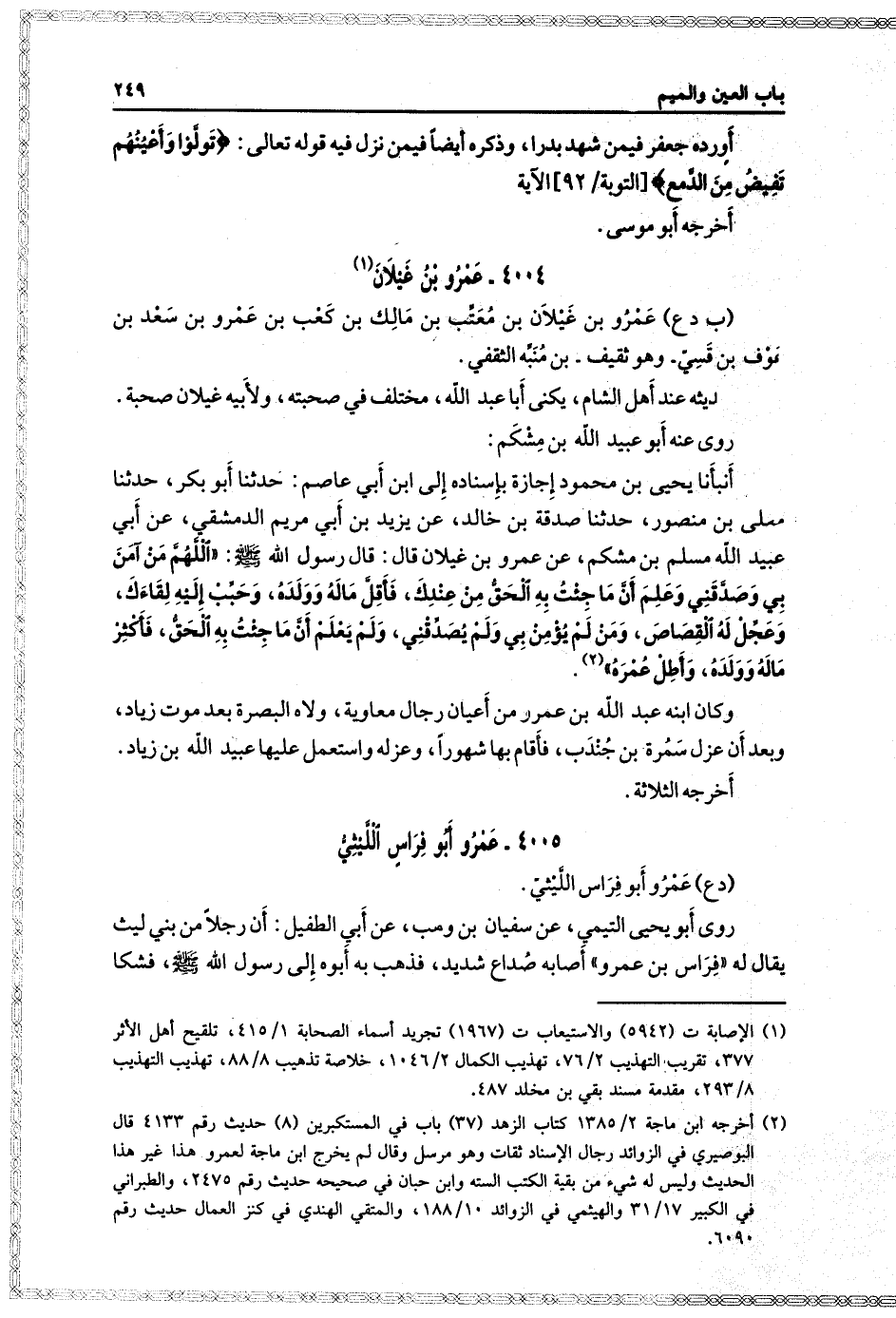 (١٣٠٣) أَنْبَأَنَا يَحْيَى بْنُ مَحْمُودٍ، إِجَازَةً بِإِسْنَادِهِ إِلَى ابْنِ أَبِي عَاصِمٍ، حَدَّثَنَا أَبُو بَكْرٍ، حَدَّثَنَا مُعَلَّى بْنُ مَنْصُورٍ، حَدَّثَنَا صَدَقَةُ بْنُ خَالِدٍ، عَنْ يَزِيدَ بْنِ أَبِي مَرْيَمَ الدِّمَشْقِيِّ، عَنْ أَبِي عُبَيْدِ اللَّهِ مُسْلِمِ بْنِ مِشْكَمٍ، عَنْ عَمْرِو بْنِ غَيْلانَ، قَالَ: قَالَ رَسُولُ اللَّهِ صَلَّى اللَّهُ عَلَيْهِ وَسَلَّمَ: " اللَّهُمَّ مَنْ آمَنَ بِي وَصَدَّقَنِي وَعَلِمَ أَنَّ مَا جِئْتُ بِهِ الْحَقُّ مِنْ عِنْدِكَ، فَأَقِلَّ مَالَهُ وَوَلَدَهُ، وَحَبِّبْ إِلَيْهِ لِقَاءَكَ، وَعَجِّلْ لَهُ الْقِصَاصَ، وَمَنْ لَمْ يُؤْمِنْ بِي وَلَمْ يُصَدِّقْنِي، وَلَمْ يَعْلَمْ أَنَّ مَا جِئْتُ بِهِ الْحَقُّ، فَأَكْثِرْ مَالَهُ وَوَلَدَهُ، وَأَطِلْ عُمْرَهُ " وكان ابنه عَبْد اللَّه بْن عَمْرو من أعيان رجال معاوية، ولاه البصرة بعد موت زياد، وبعد أن عزل سمرة بْن جندب، فأقام بها شهورًا، وعزله، واستعمل عليها عُبَيْد اللَّه بْن زياد.