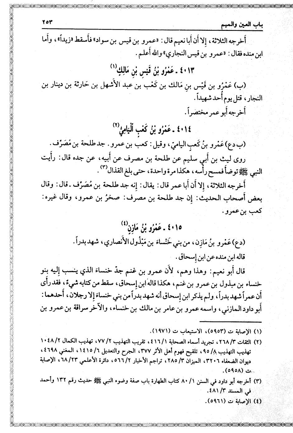 قَالَ أَبُو نعيم: وهذا وهم، لأن عَمْرو بْن غنم جد خنساء الَّذِي ينسب إِلَيْه بنو خنساء بْن مبذول بْن عَمْرو بْن غنم، هكذا قاله ابْن إِسْحَاق، سقط من كتابه شيء، فقد رَأَى أن عمرًا شهد بدرًا، ولم يذكر ابْن إِسْحَاق أَنَّهُ شهد بدرًا من بني خنساء إلا رجلان، أحدهما: أَبُو دَاوُد الْمَازِنِي، واسمه عَمْرو بْن عَامِر بْن مَالِك بْن خنساء، والآخر سراقة بْن عَمْرو بْن عطية بْن خنساء، وَإِذا نظر فِي نسخة صحيحة تبين لَهُ وهمه، وكان بين عَمْرو بْن مازن، وبين الْإِسْلَام أكثر من مائة سنة، فعده فِي الصحابة، وكثر بِهِ كتابه.
