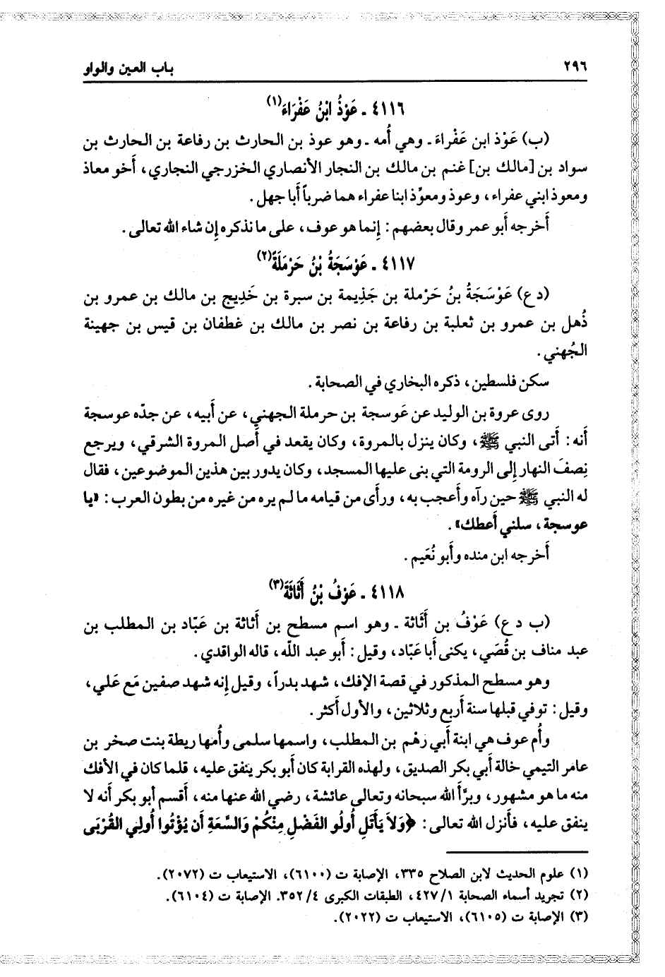 ب: عوذ بْن عفراء وهي أمه، وهو عوذ بْن الحارث بْن رفاعة بْن الحارث بْن سواد بْن مَالِك بْن غنم بْن مَالِك بْن النجار الْأَنْصَارِيّ الخزرجي النجاري، أخو مُعَاذ ومعوذًا بني عفراء، وعود ومعوذ ابنا عفراء هما ضربا أبا جهل.
