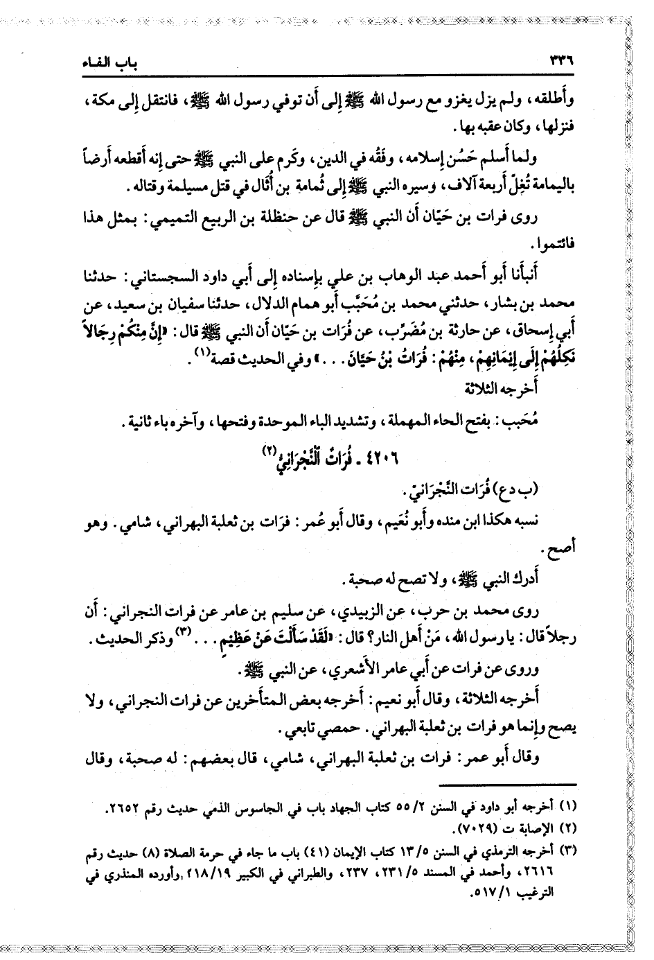 ب د ع: فرات النجراني نسبه هكذا ابْن منده، وَأَبُو نعيم، وقَالَ أَبُو عُمَر: فرات بْن ثعلبة البهراني، شامي، وهو أصح.