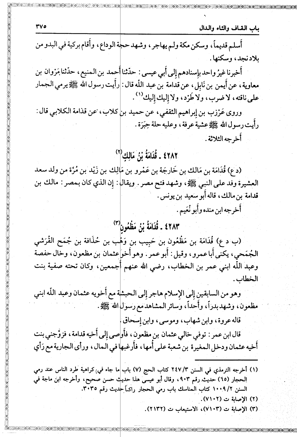 د ع: قدامة بْن مَالِك بْن خارجة بْن عَمْرو بْن مَالِك بْن زَيْد بْن مرة من ولد سعد العشيرة.