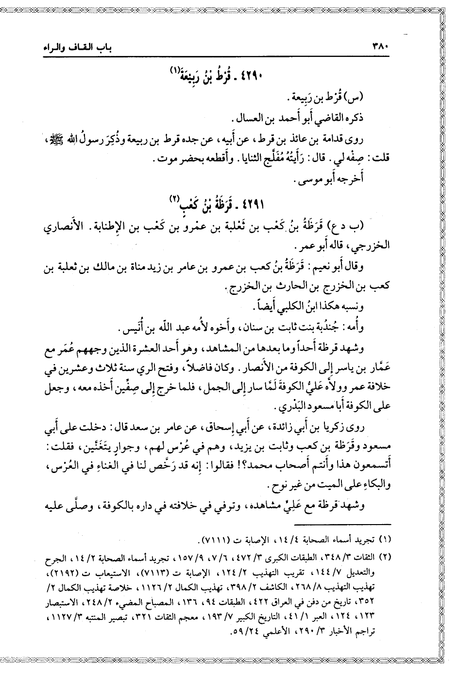 ب د ع: قرظة بْن كعب بْن ثعلبة بْن عَمْرو بْن كعب بْن الإطنابة الْأَنْصَارِيّ الخزرجي قاله أَبُو عُمَر.
