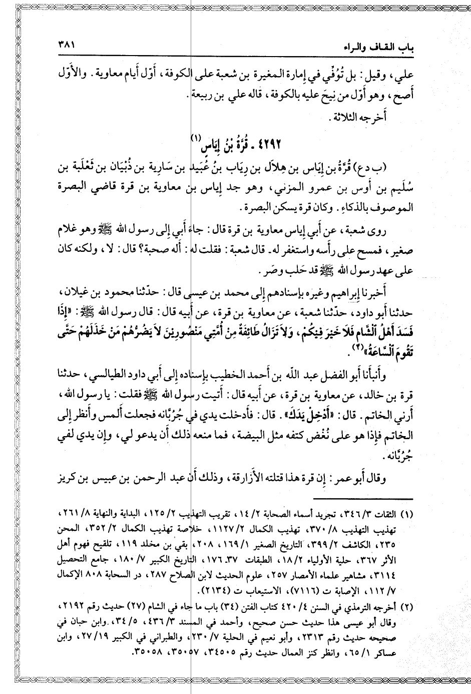 (١٣٧٤) وأَنْبَأَنَا أَبُو الْفَضْلِ عَبْدُ اللَّهِ بْنُ أَحْمَدَ الْخَطِيبُ، بِإِسْنَادِهِ إِلَى أَبِي دَاوُدَ الطَّيَالِسِيِّ، حَدَّثَنَا قُرَّةُ بْنُ خَالِدٍ، عَنْ مُعَاوِيَةَ بْنِ قُرَّةَ، عَنْ أَبِيهِ، قَالَ: أَتَيْتُ رَسُولَ اللَّهِ صَلَّى اللَّهُ عَلَيْهِ وَسَلَّمَ فَقُلْتُ: يَا رَسُولَ اللَّهِ، أَرِنِي الْخَاتَمَ، قَالَ: " أَدْخِلْ يَدَكَ "، قَالَ: فَأَدْخَلْتُ يَدِي فِي جِرِبَّانِهِ فَجَعَلْتُ أَلْمِسُ وَأَنْظُرُ إِلَى الْخَاتَمِ فَإِذَا هُوَ عَلَى نُغْضِ كَتِفِهِ مِثْلَ الْبَيْضَةِ، فَمَا مَنَعَهُ ذَلِكَ أَنْ يَدْعُوَ لِي، وَإِنَّ يَدِي لَفِي جِرِبَّانِهِ وقَالَ أَبُو عُمَر: إن قُرَّة هَذَا قتلته الأزارقة، وذلك أن عَبْد الرَّحْمَن بْن عبيس بْن كريز الْقُرَشِيّ العبشمي، خرج أيام معاوية فِي نحو عشرين ألفًا يقاتلون الأزارقة، ومعه أخوه مُسْلِم بْن عبيس، وهما ابنا عم عَبْد اللَّه بْن عَامِر بْن كريز، وكان فِي العسكر قُرَّة بْن إياس المزني وابنه معاوية، فقتل قُرَّة ذَلِكَ اليوم، وقتل معاوية يومئذ قاتل أَبِيهِ.