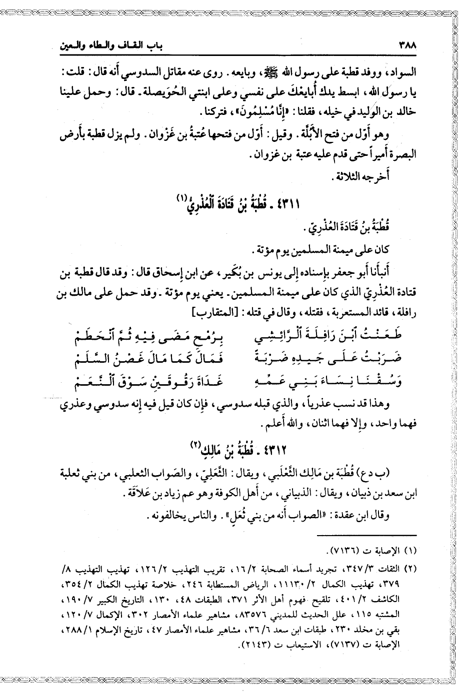 قطبة بْن قَتَادَة العذري كَانَ عَلَى ميمنة المسلمين يَوْم مؤتة.